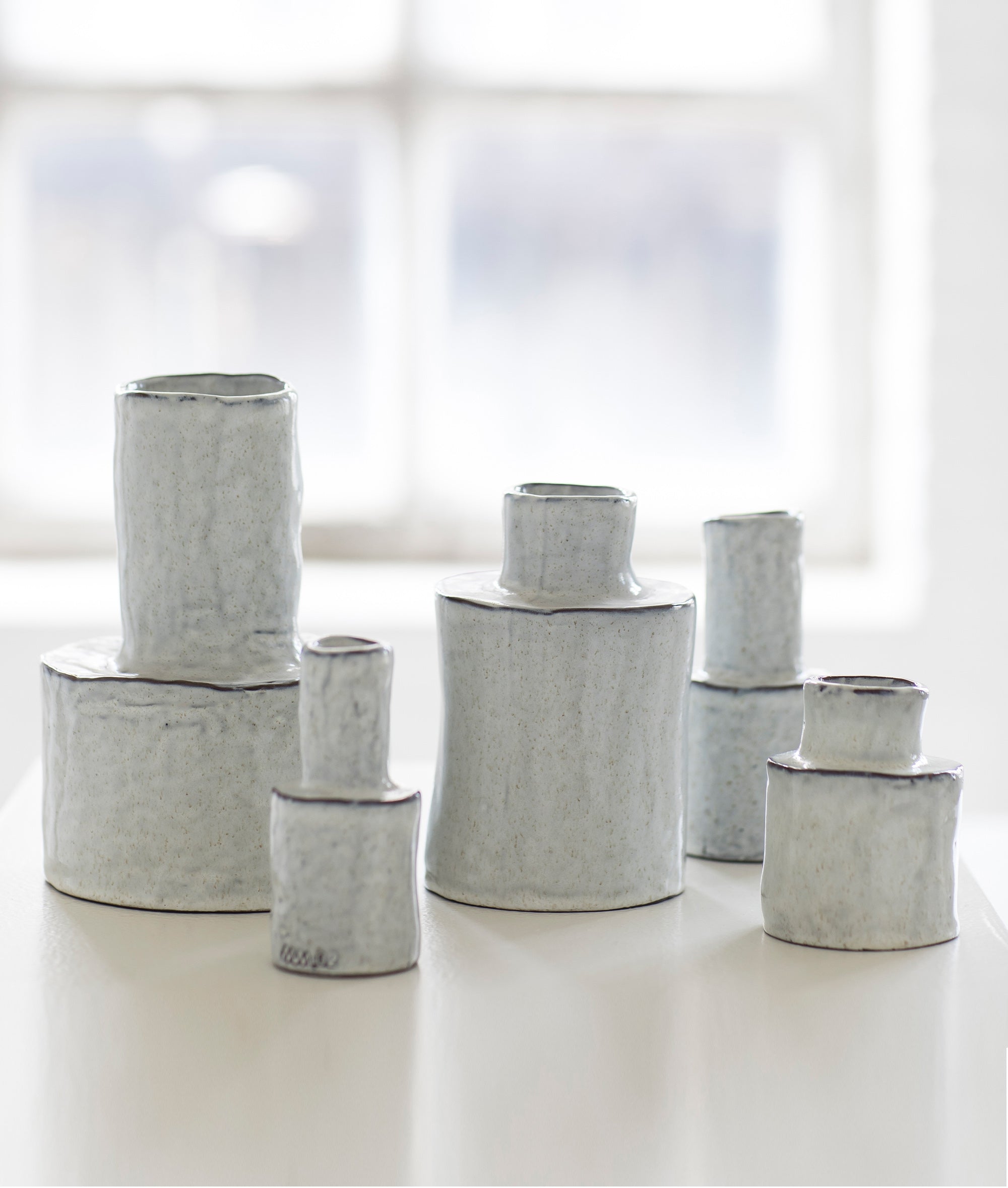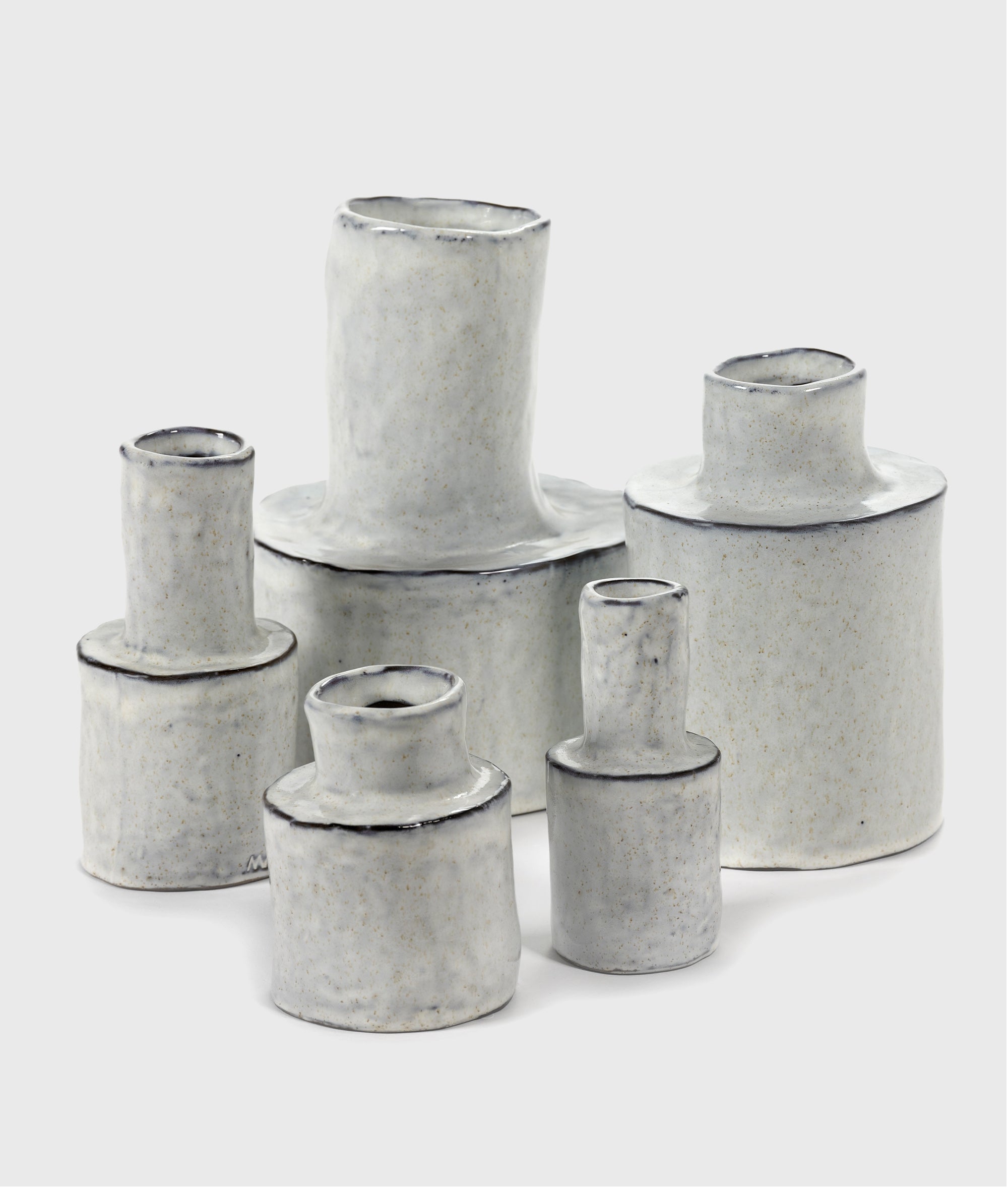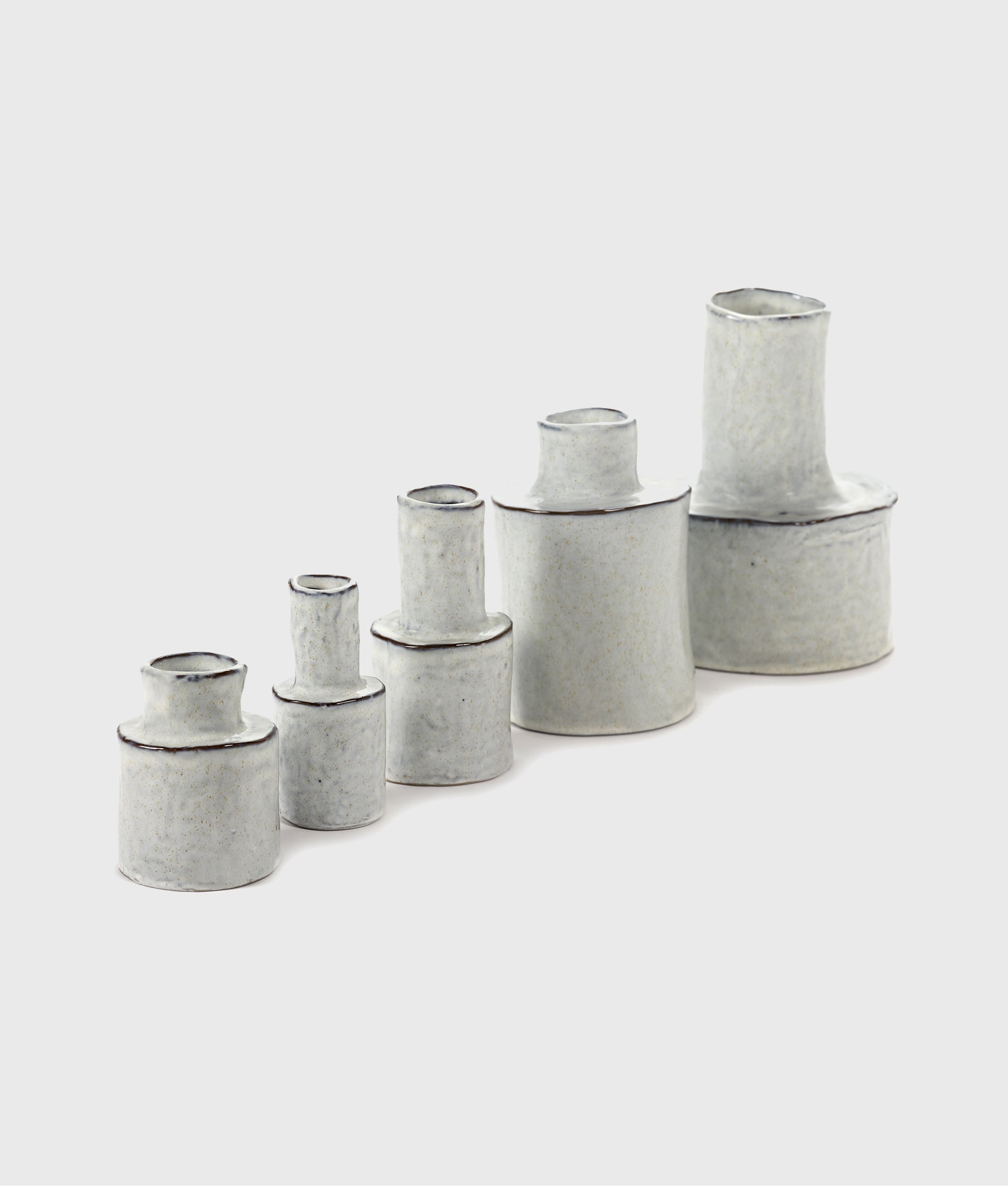 Small Serax vase, made of glazed stoneware. Designed by Marie Michielssen. The white Héléna vase stands out because of its simple cylinder shape. The handicraft is clearly visible in their unusual shapes. The vases are finished by hand, making each piece unique. Dimensions: L 10 W 10 H 15 CM.|