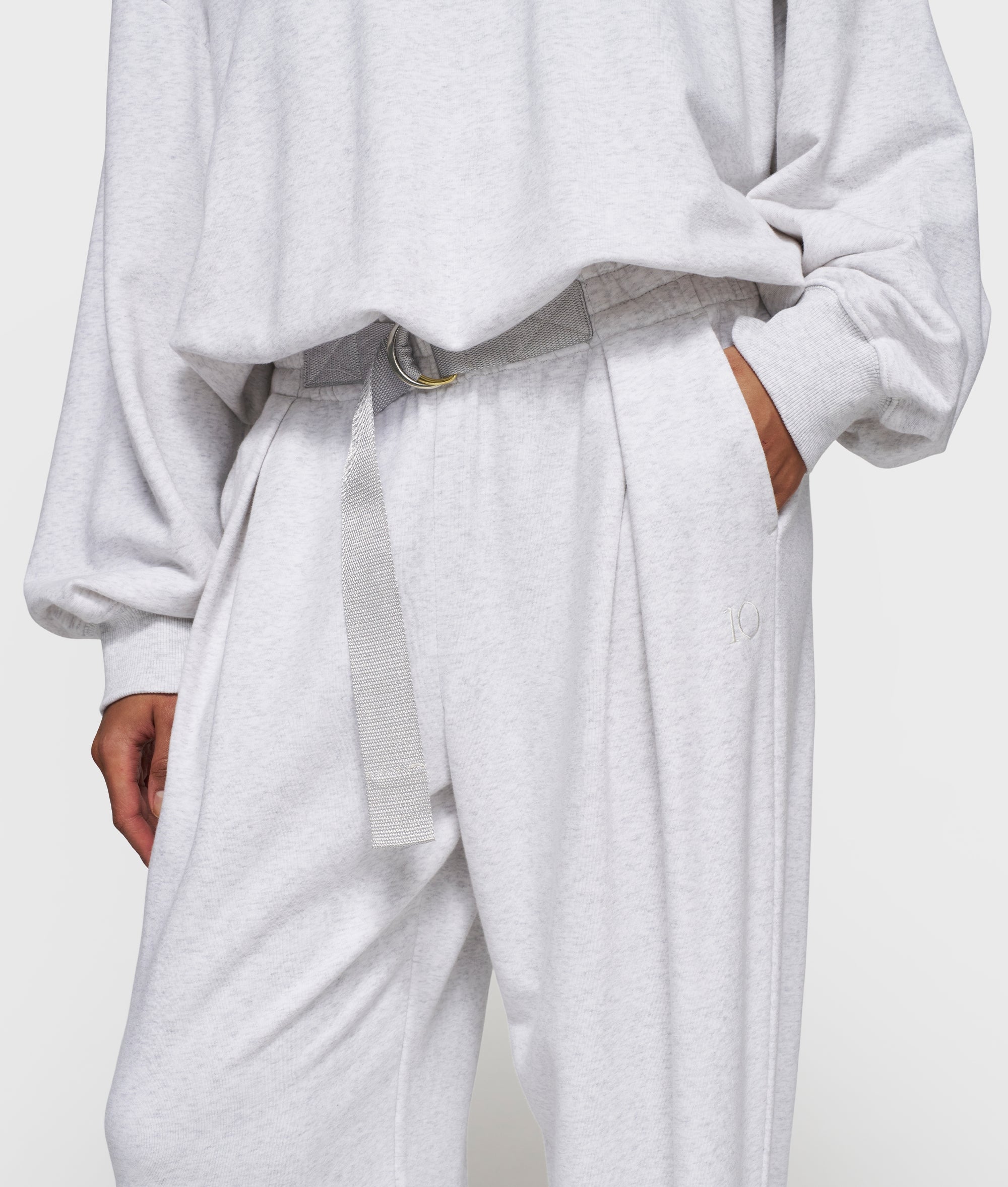 Relaxed fit jogger with a mid-rise waistband made from light old school fleece. Features an elasticated waistband with a patch belt detail, slanted side pockets, adjustable cuffs, two fake back pockets and a ’10’ monogram embroidery under the left side pocket.|