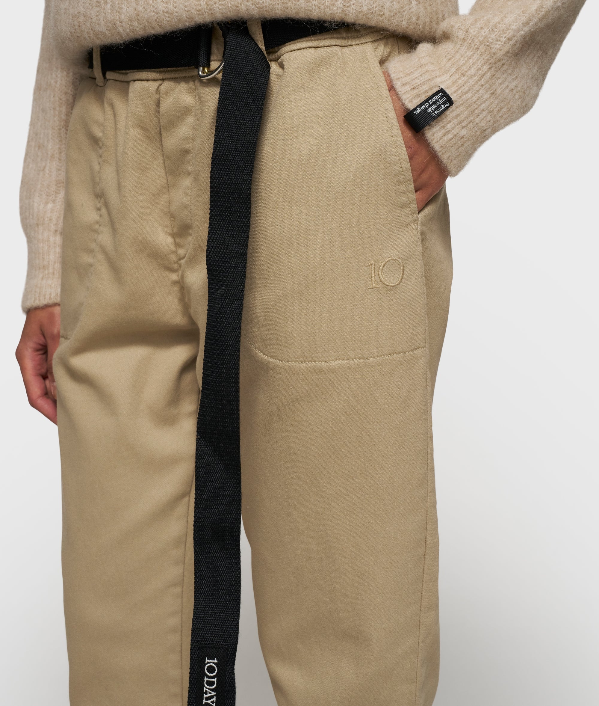 Regular fit jogger with belt, made from a comfortable cotton polyester blend. Features an elasticated waistband with belt loops and an adjustable belt with buckle, slanted front pockets, a fake back pocket, a ’10DAYS’ logo on the belt and a ’10’ embroidery below the left side pocket.|