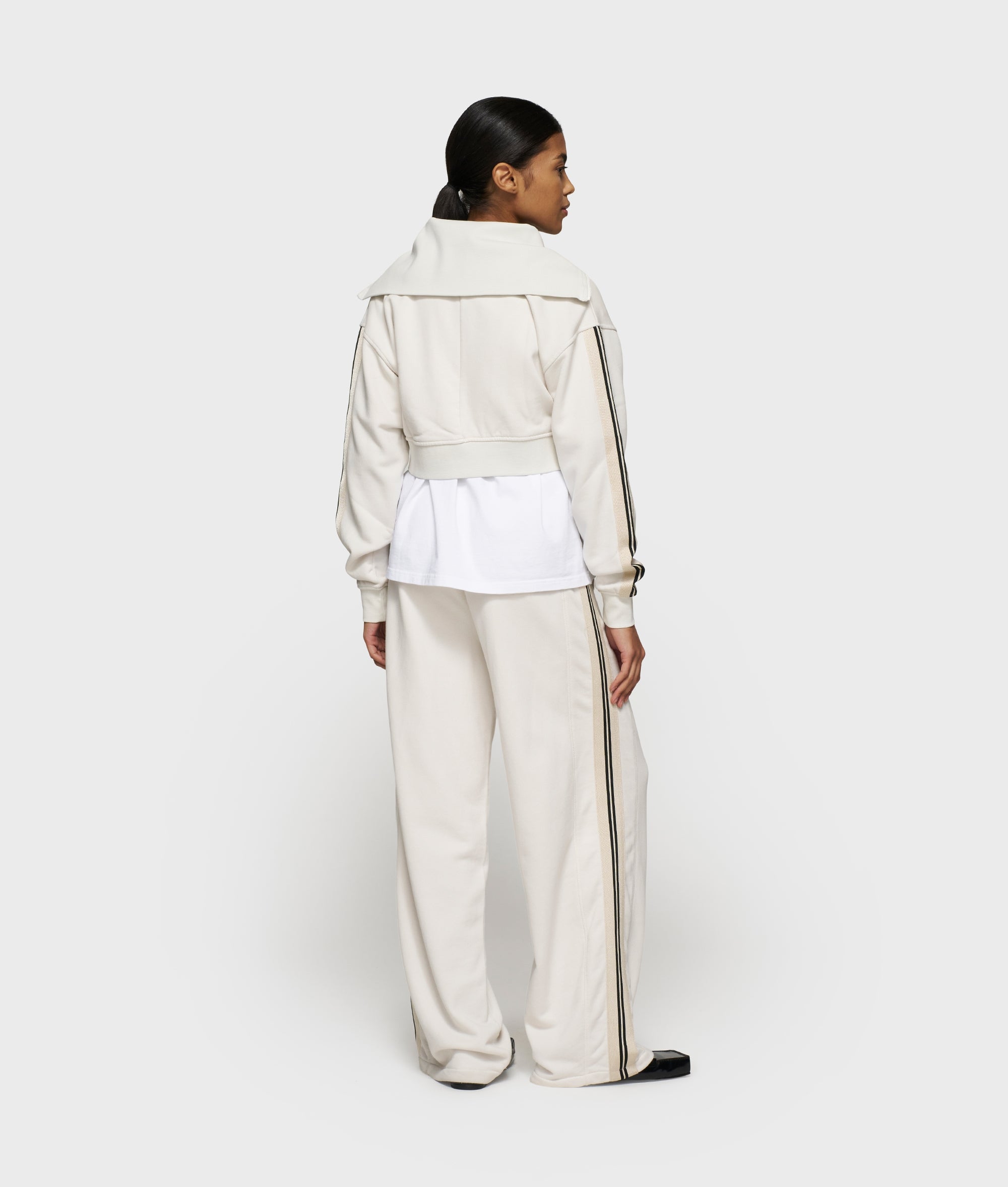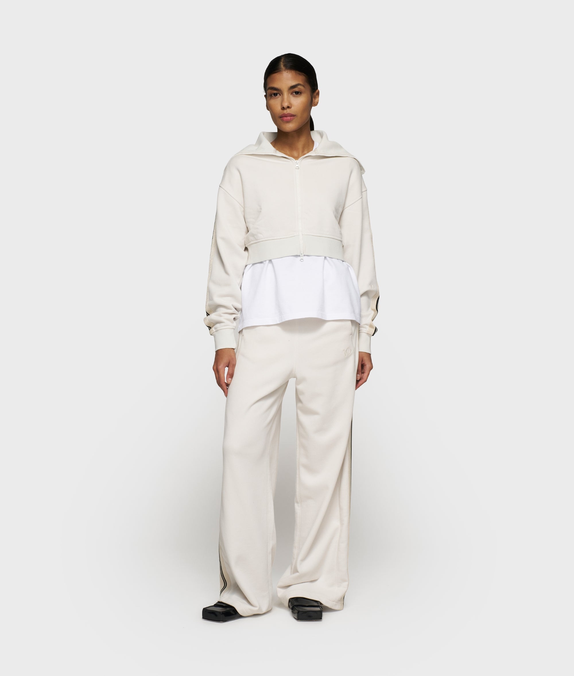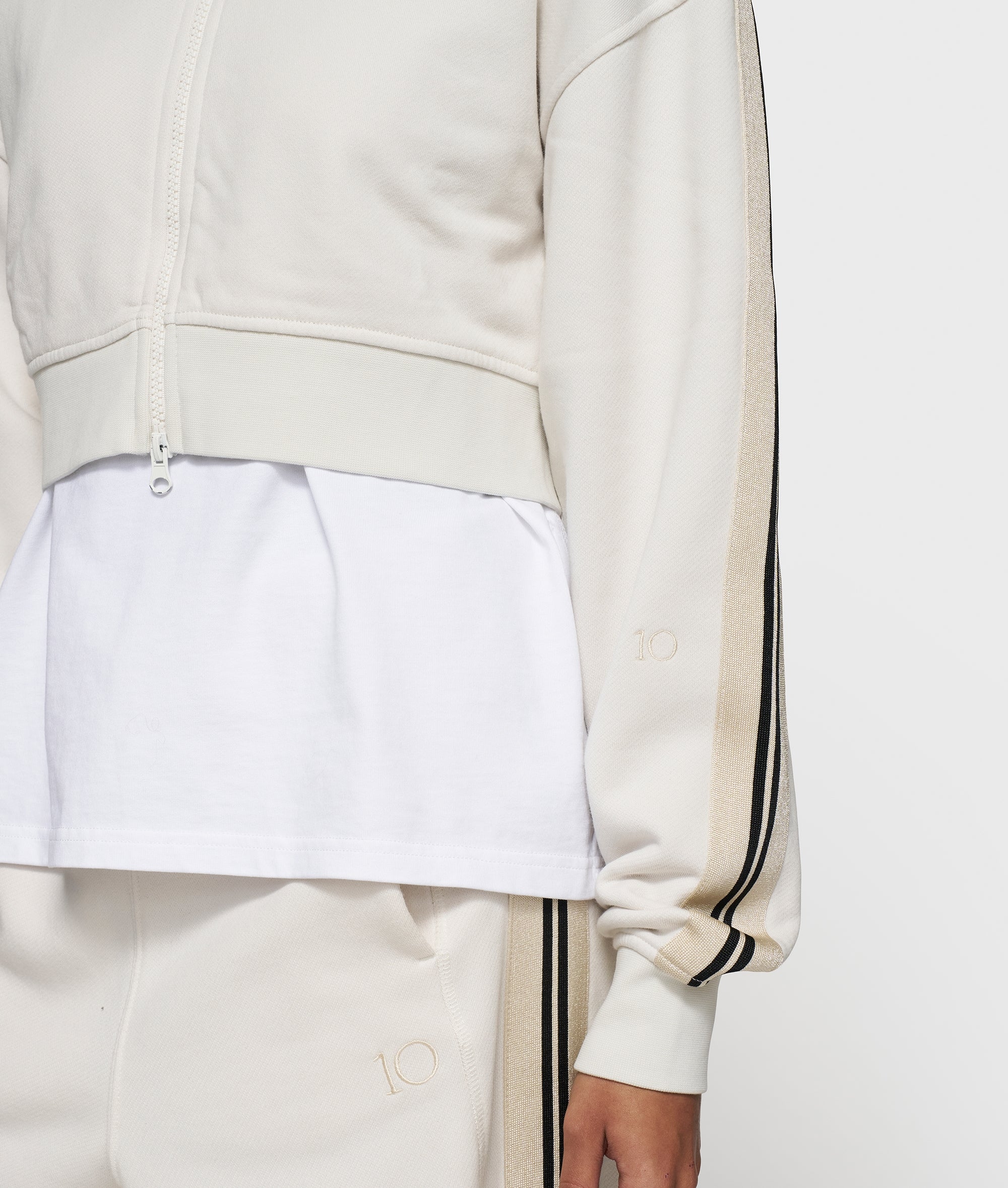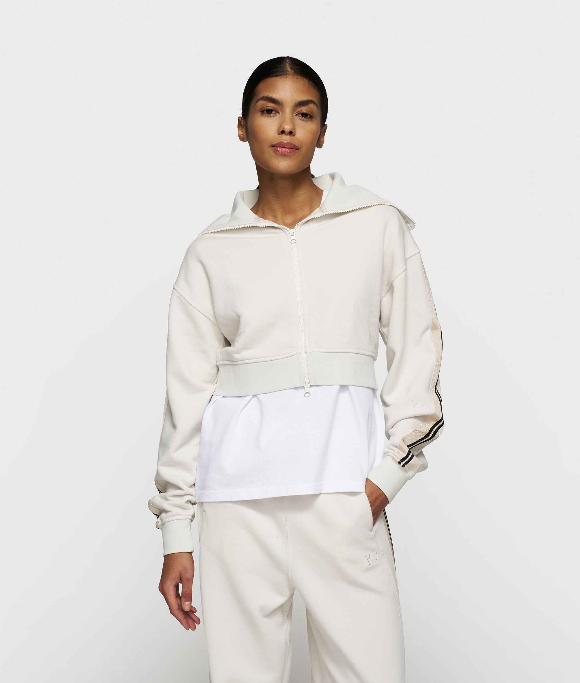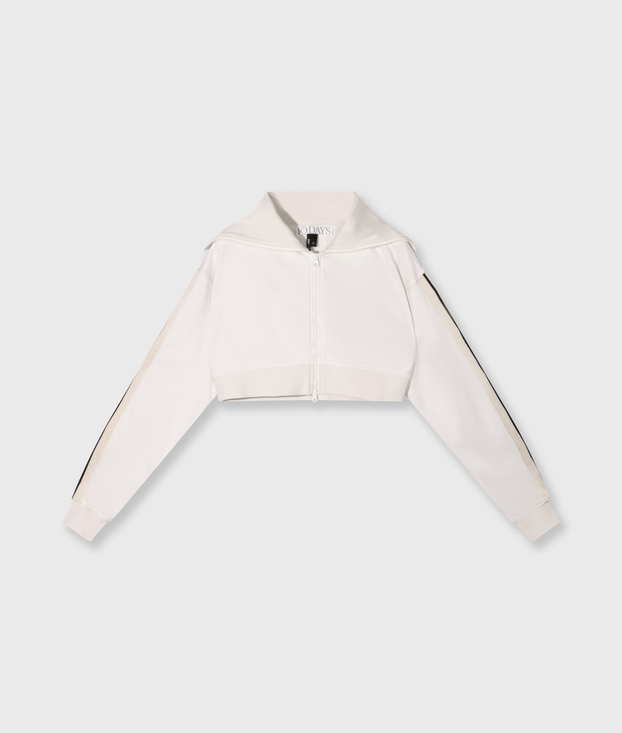 Regular fit cropped zip cardigan, made from soft cotton fleece. Features a ribbed collar, dropped shoulders, tape details along the sleeves, a ’10DAYS’ canvas label on the back and a ’10’ monogram embroidery on the left sleeve.|