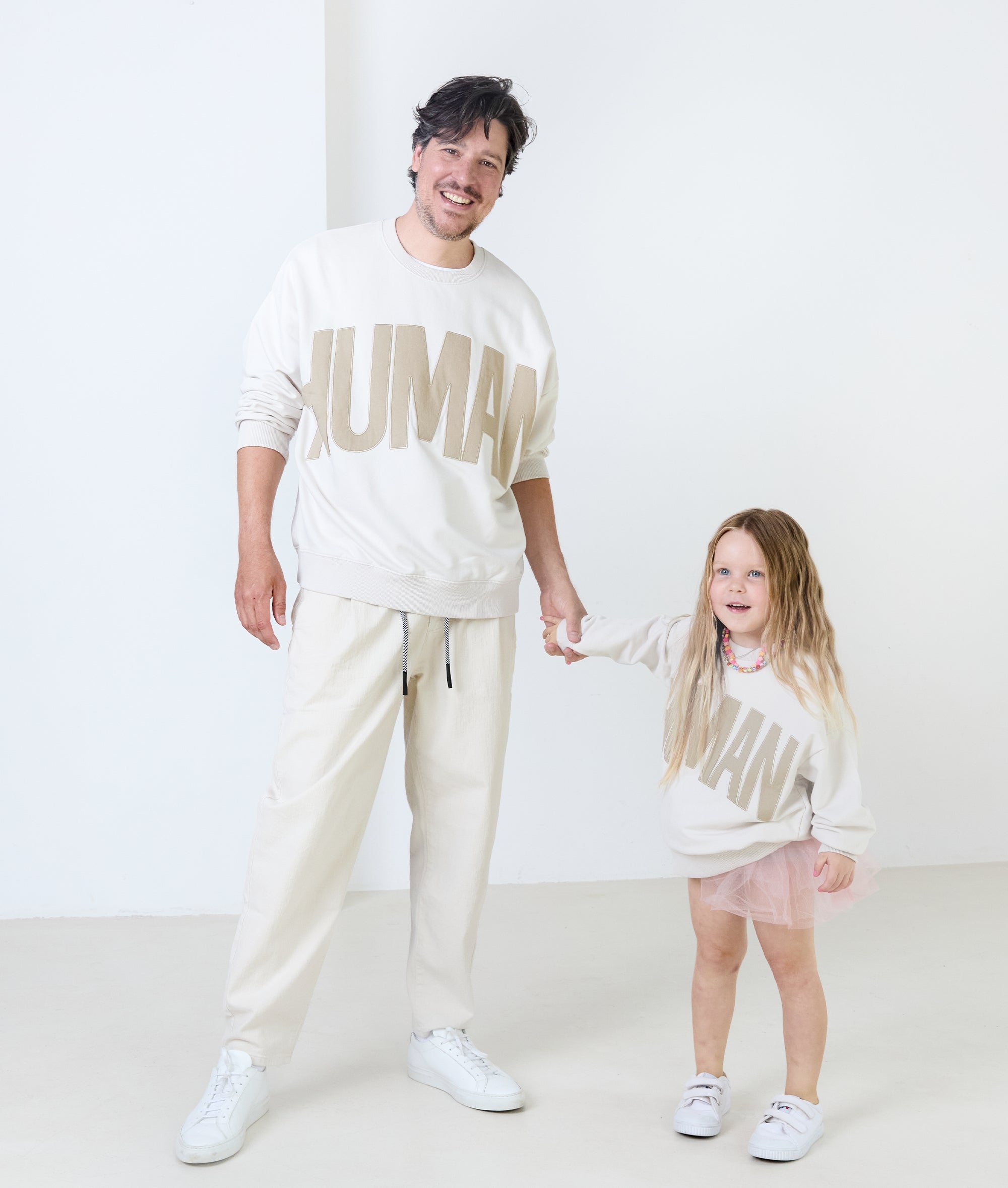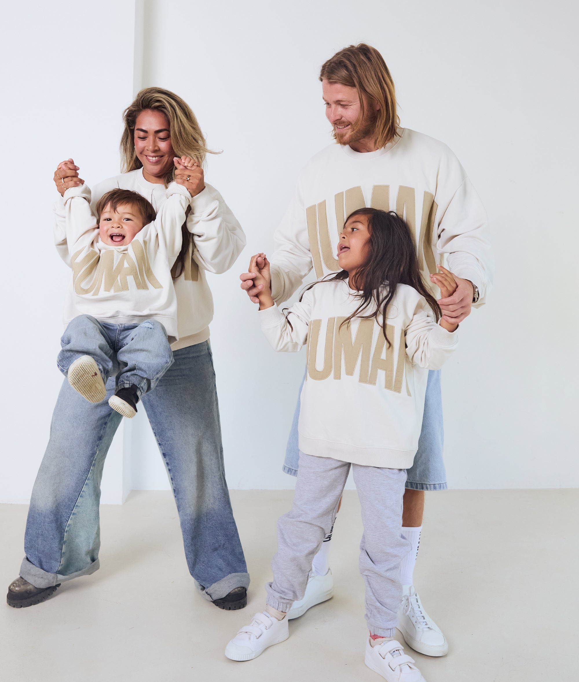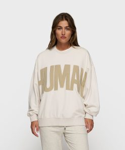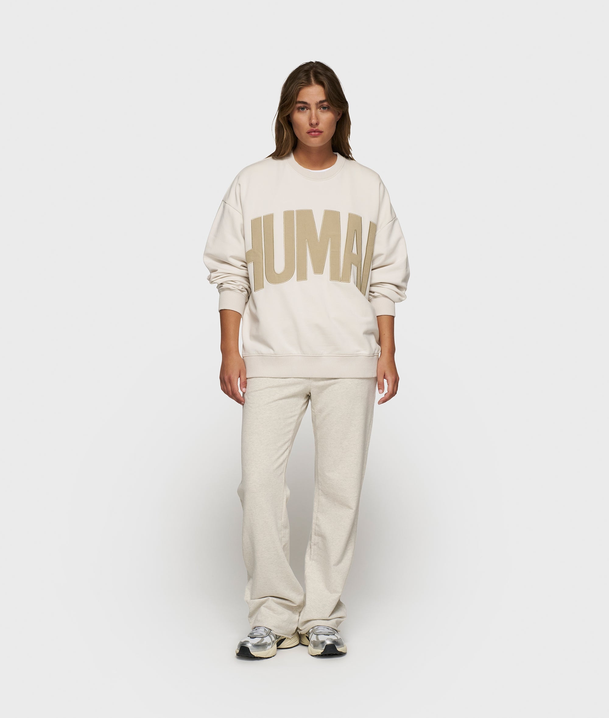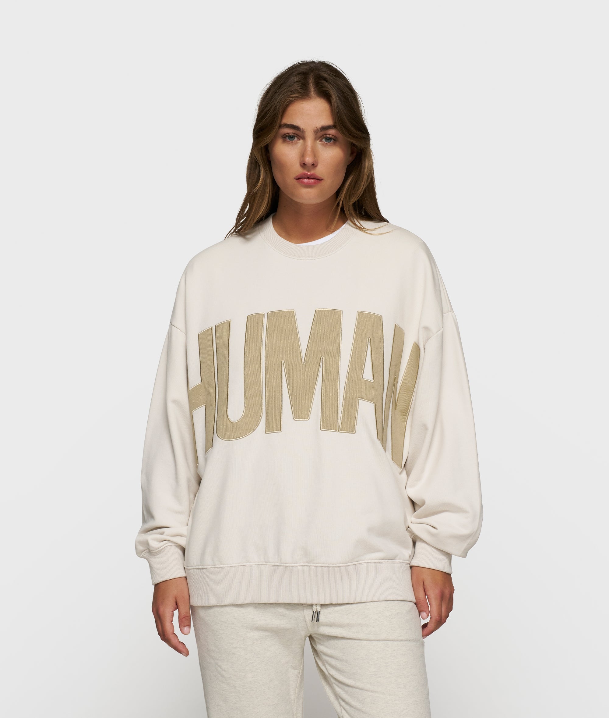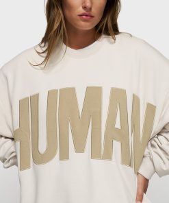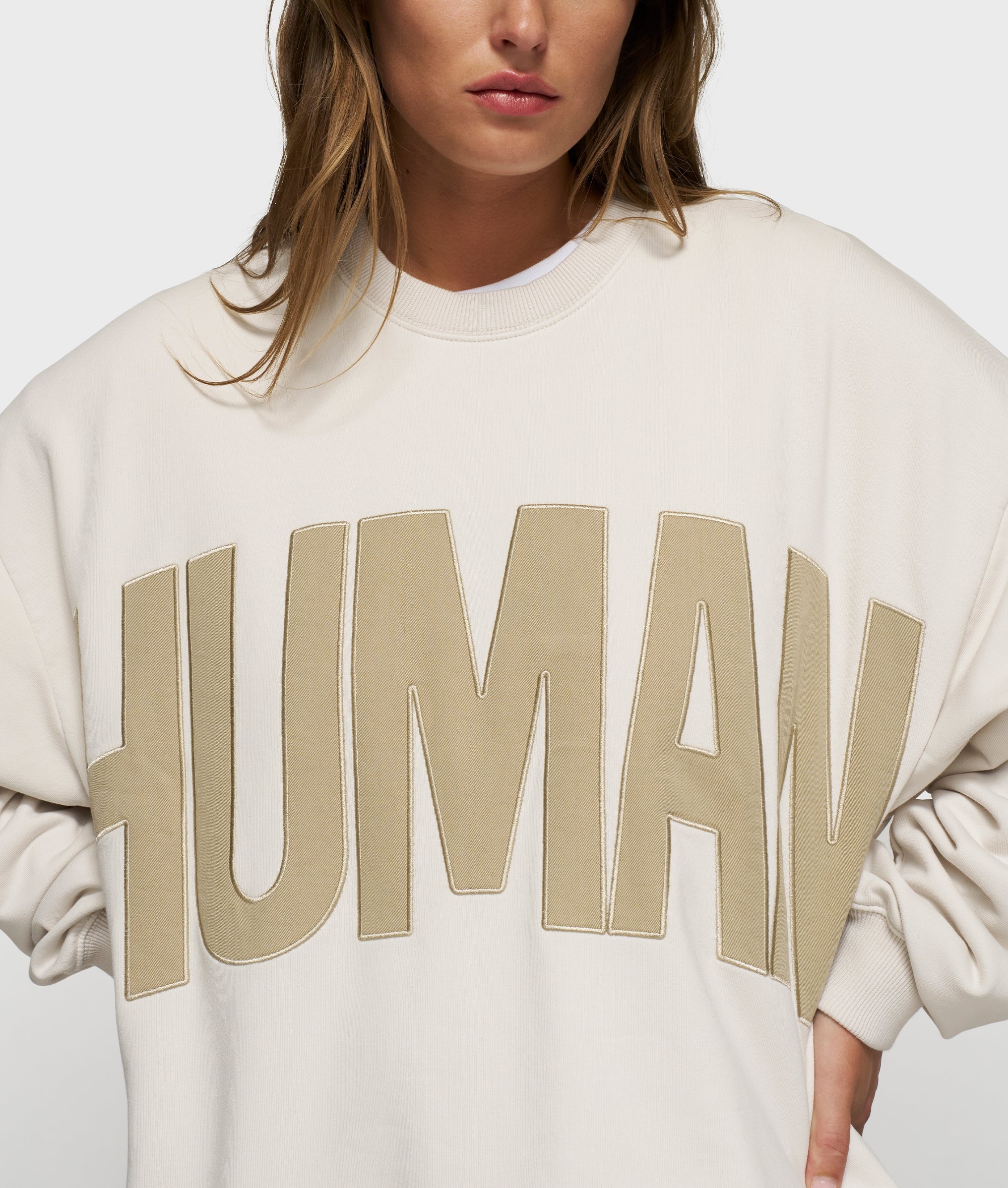 The New oversized fit HUMAN sweater with raglan sleeves, ribbed cuffs, a satin HUMAN patch on the chest and a ’10’ monogram embroidery on the back. Made of soft old school fleece. Unisex, for young and old. Because, we’re all Human.|