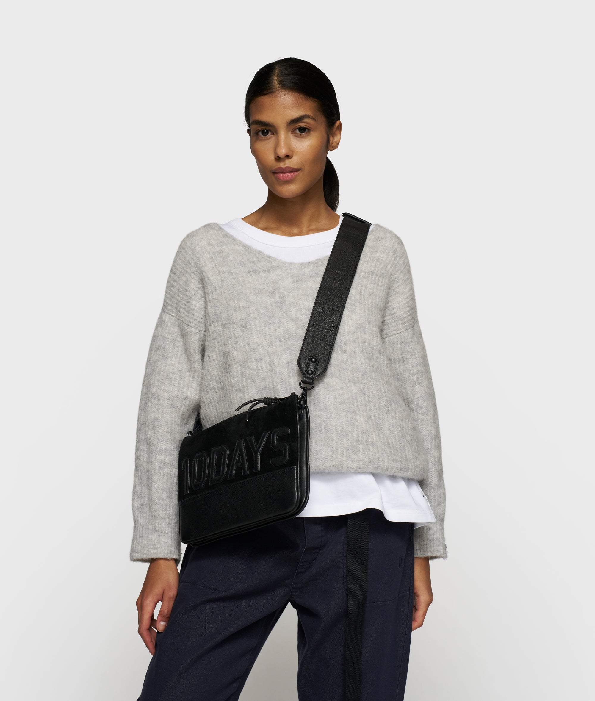 Mini leather pouch with suede finish. Features a double zip closure with leather pullers, a detachable wide shoulder strap, an internal zipped pocket and a padded ’10DAYS’ patch on the front. Size: 19 x 26 cm. Shoulder strap length: 120 cm.|