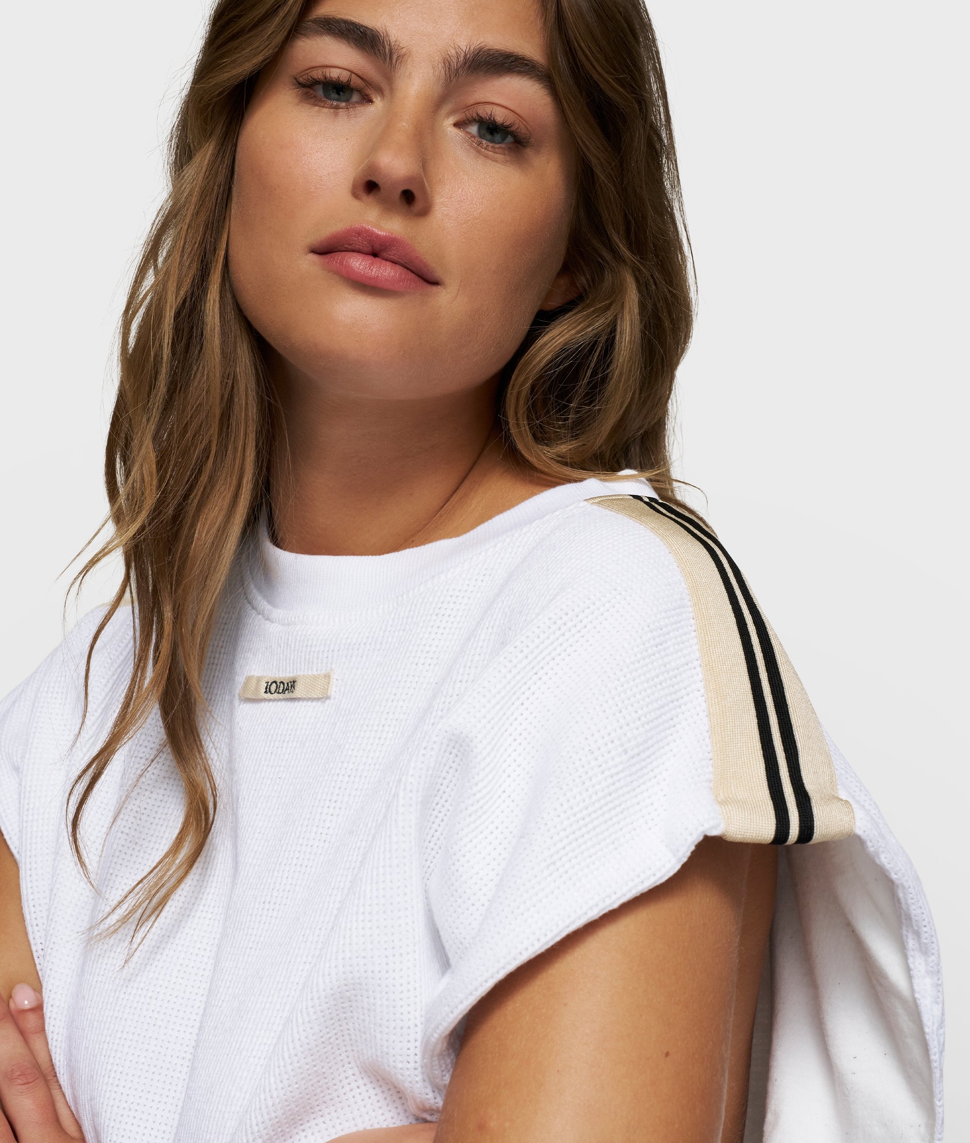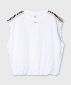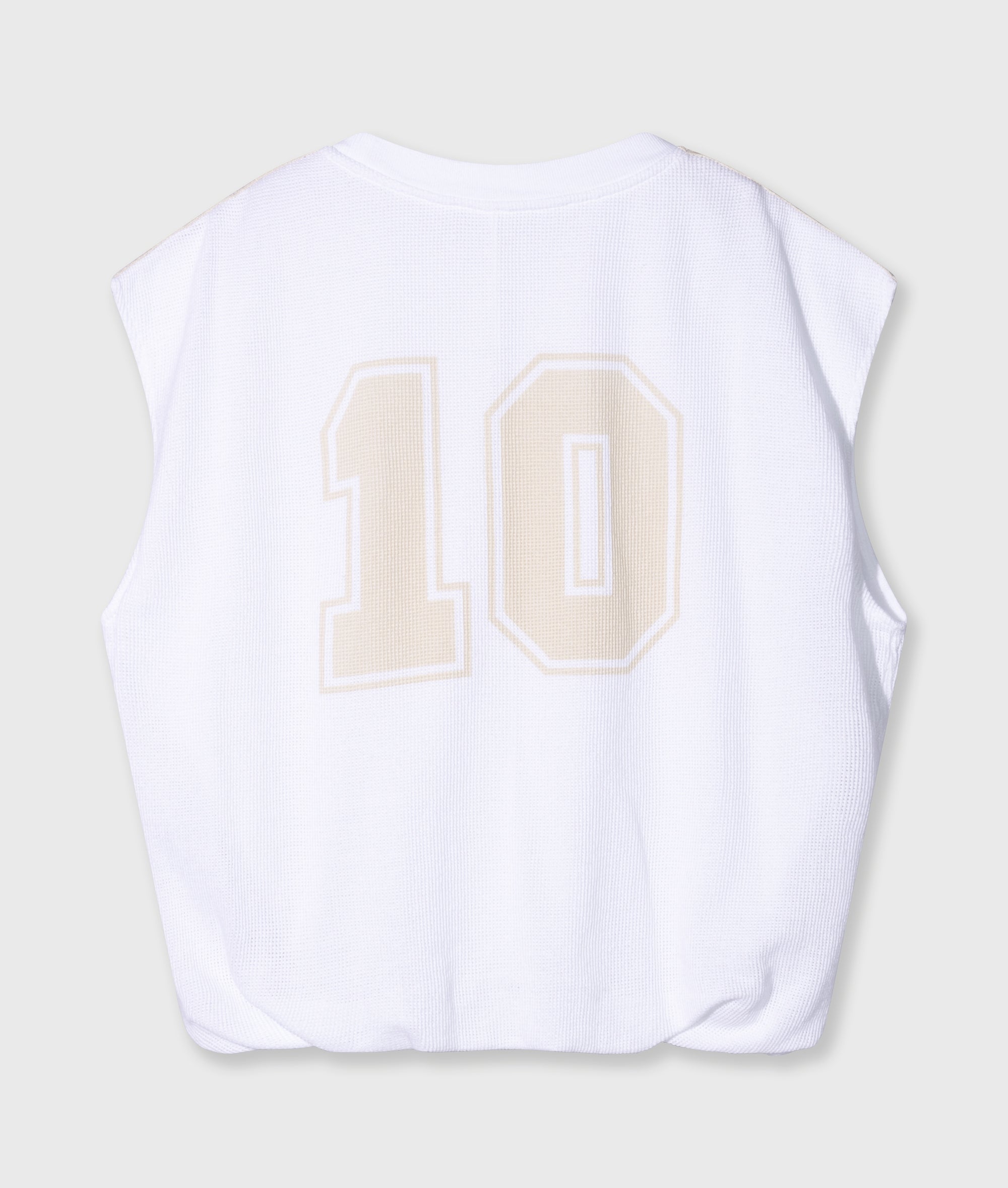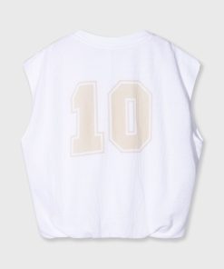 Relaxed fit sleeveless baseball mesh T-shirt made from soft GOTS-certified organic cotton. Designed with striped tapes on the shoulders, a ribbed crew neck, a pleated hem and a ‘baseball 10’ print at the centre back.|