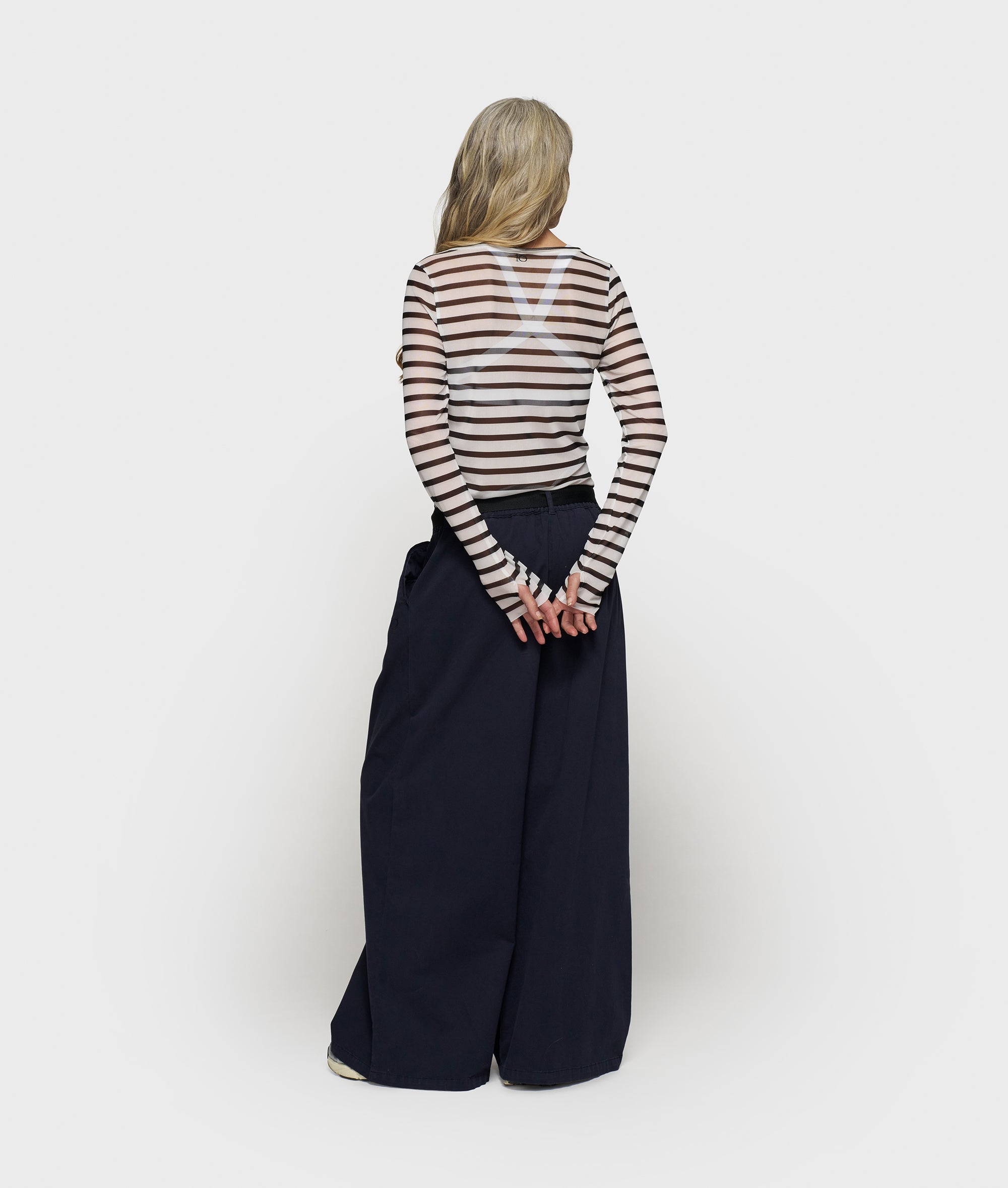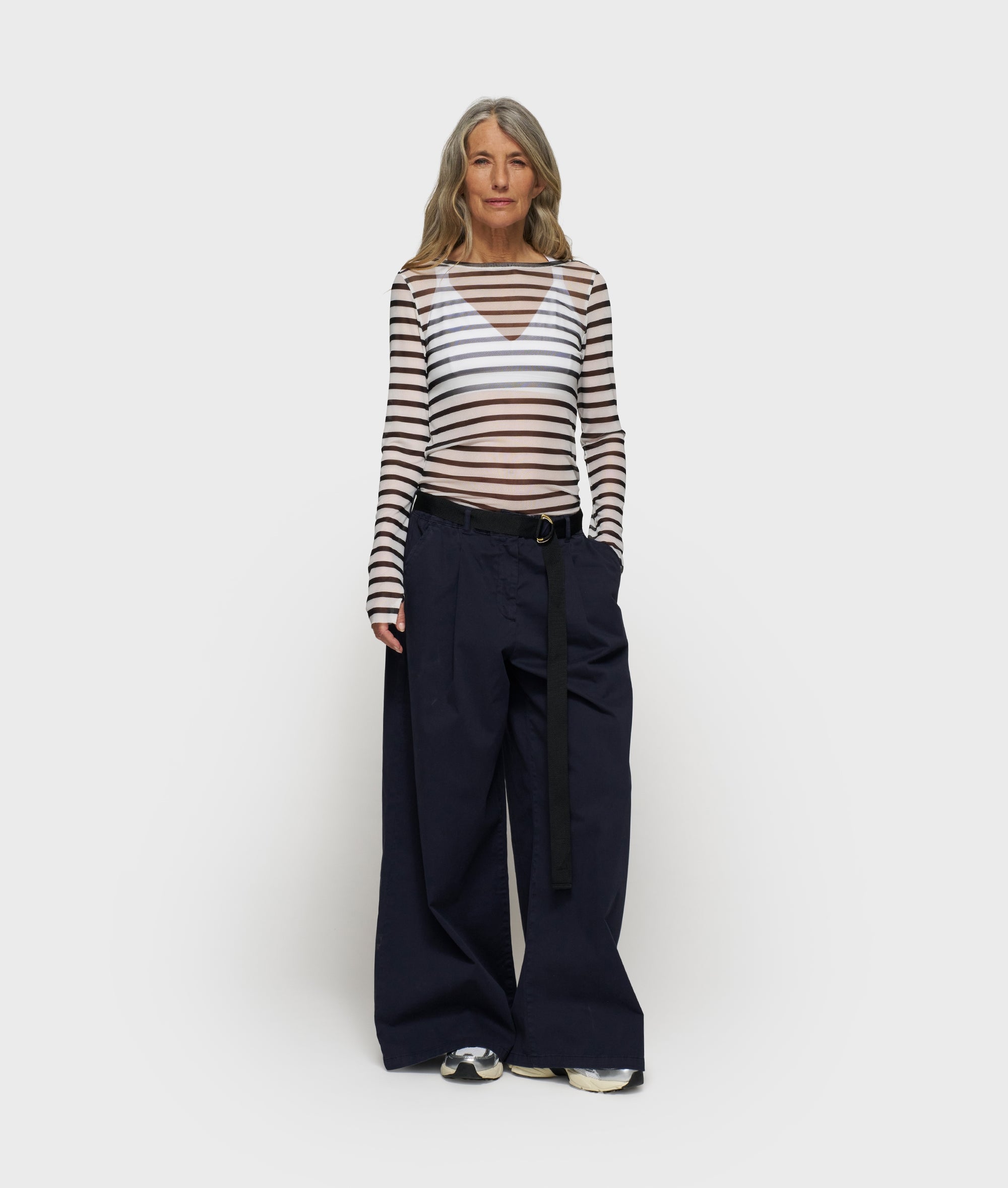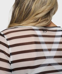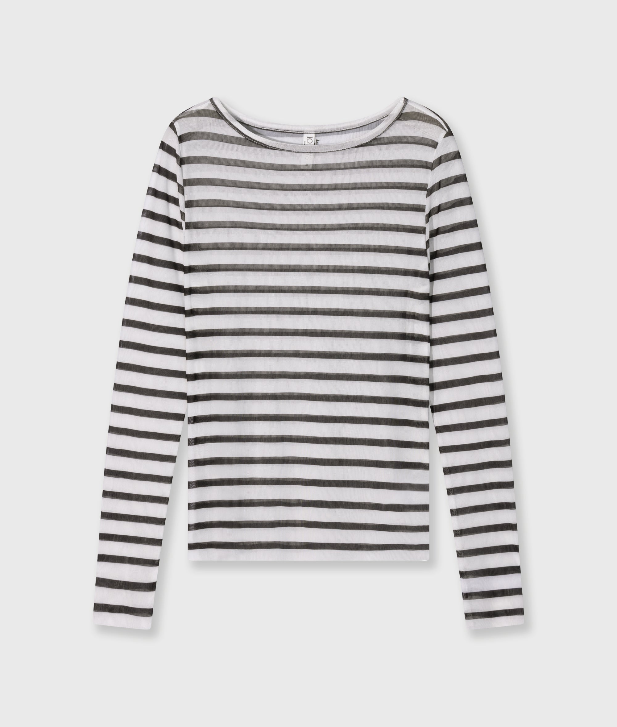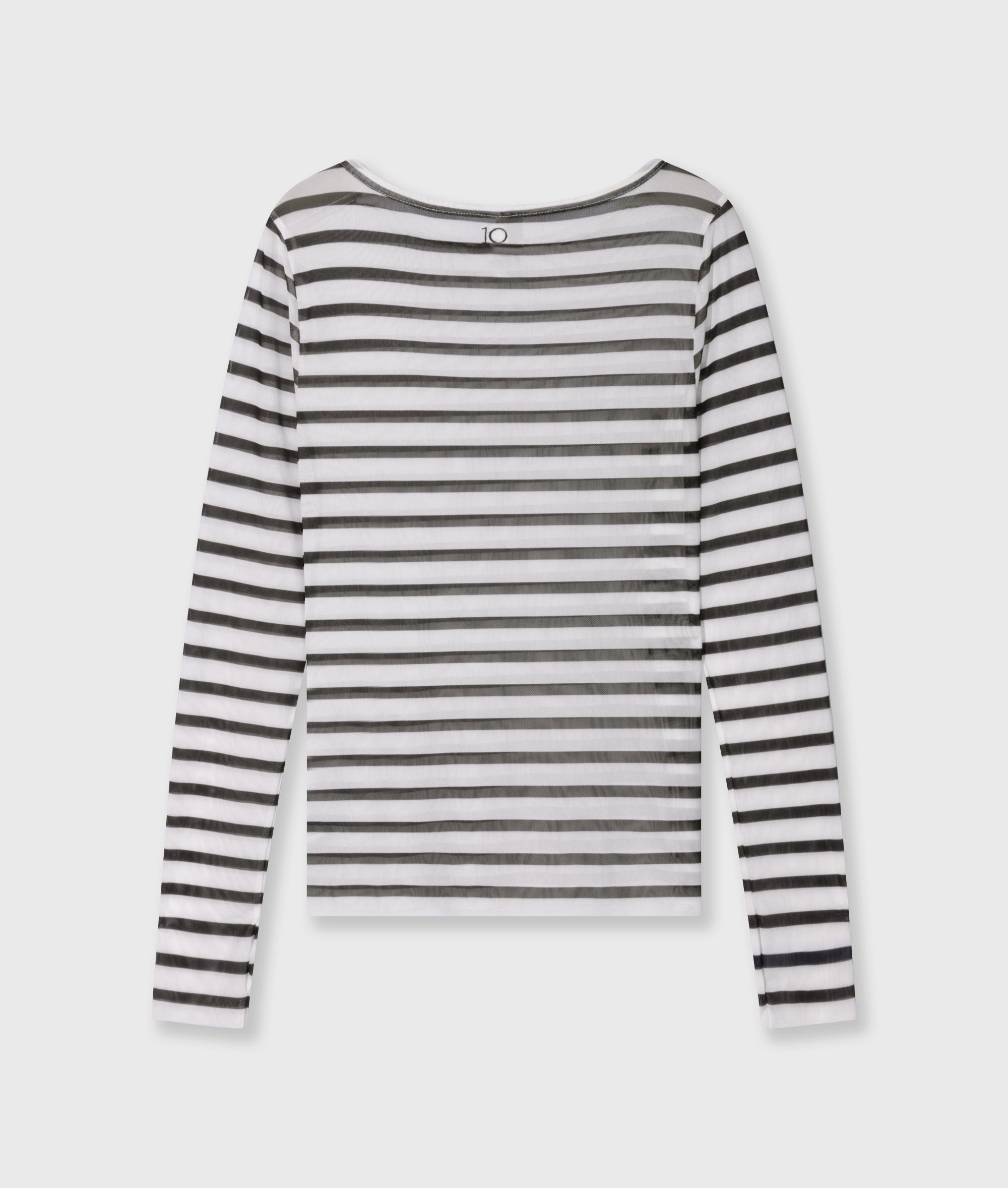 Slim fit sheer long sleeve striped top, made from mesh. Features a wide boat neckline, long sleeves with thumbholes, raw edge finishes at the hem and sleeves, and a ’10’ logo embroidery on the back.|