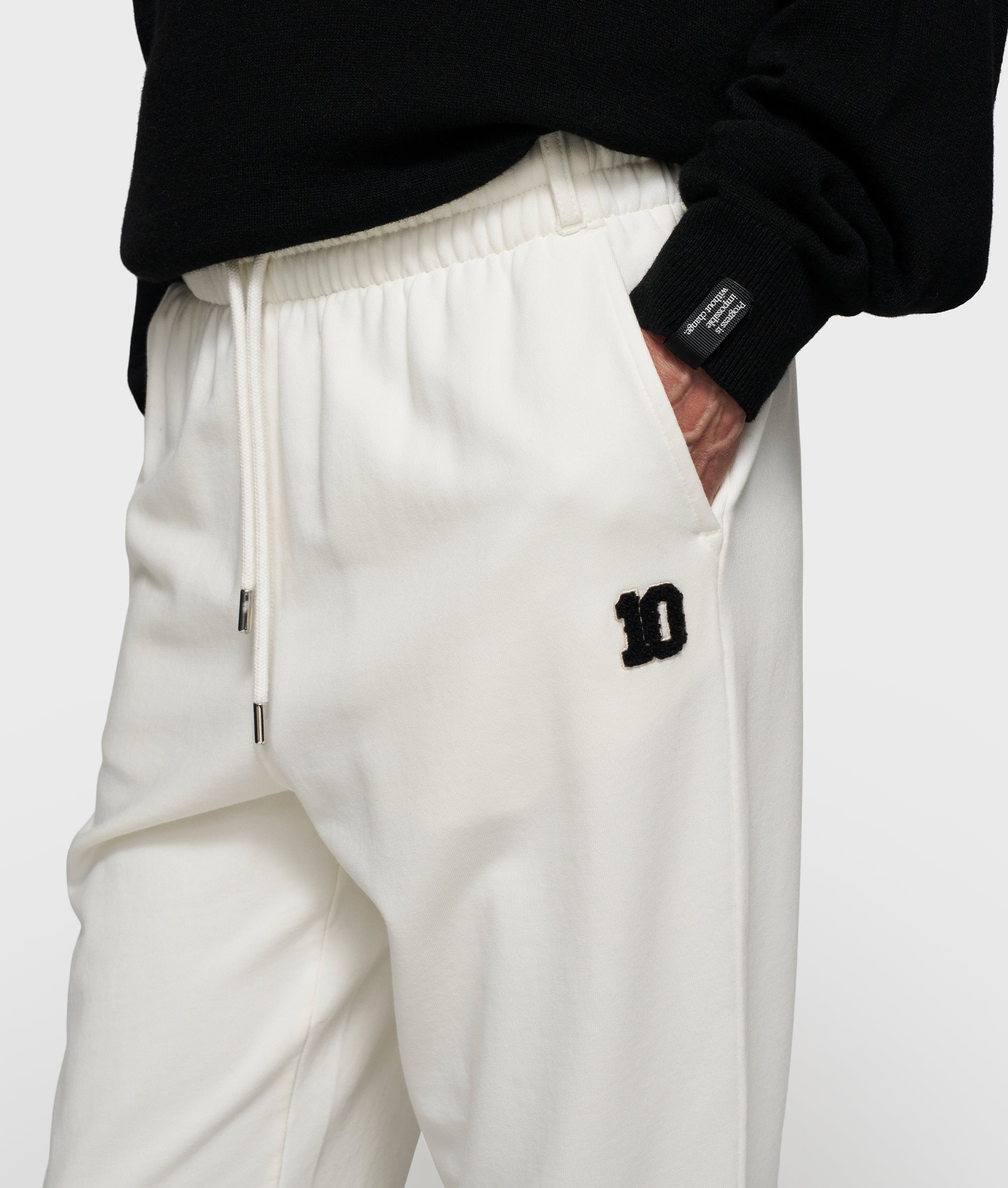 Relaxed fit mid jogger made from soft cotton. Features an elasticated waistband with drawstring, slanted side pockets, elasticated cuffs around the ankles, a patch back pocket and a ’10’ mini patch under the left side pocket.|