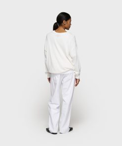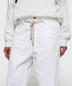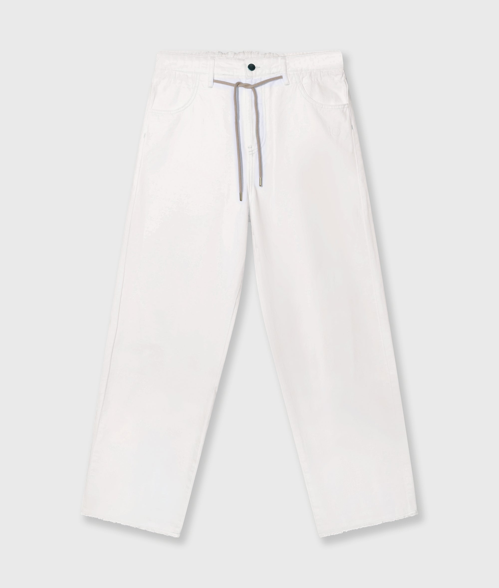 Regular fit straight leg trousers made from soft GOTS-certified organic cotton. Features a drawstring waistband, a button and zip fastening, belt loops, raw edge trouser legs, patch back pockets and a ’10’ monogram embroidery under the left front pocket.|