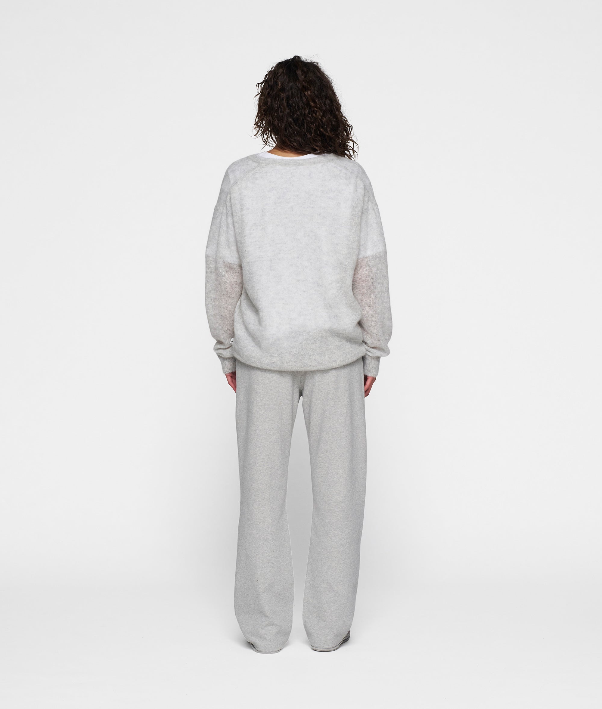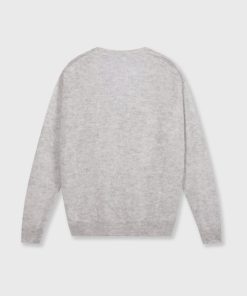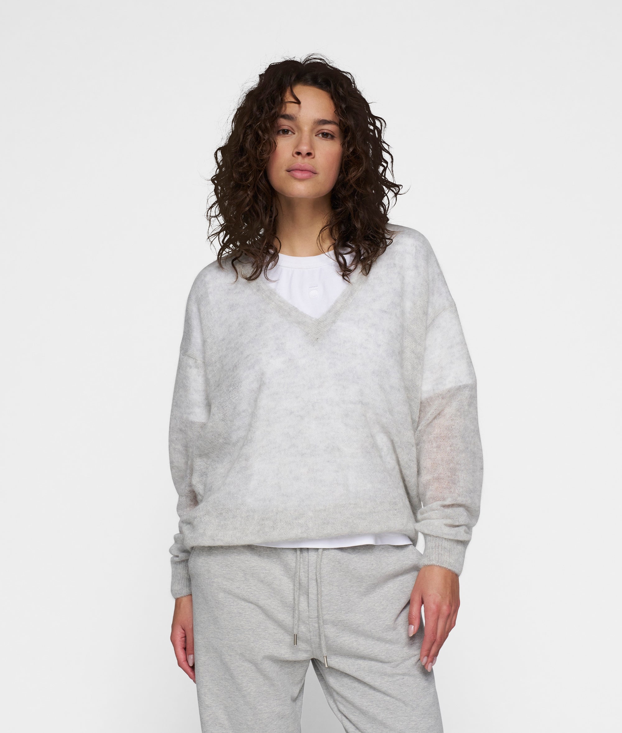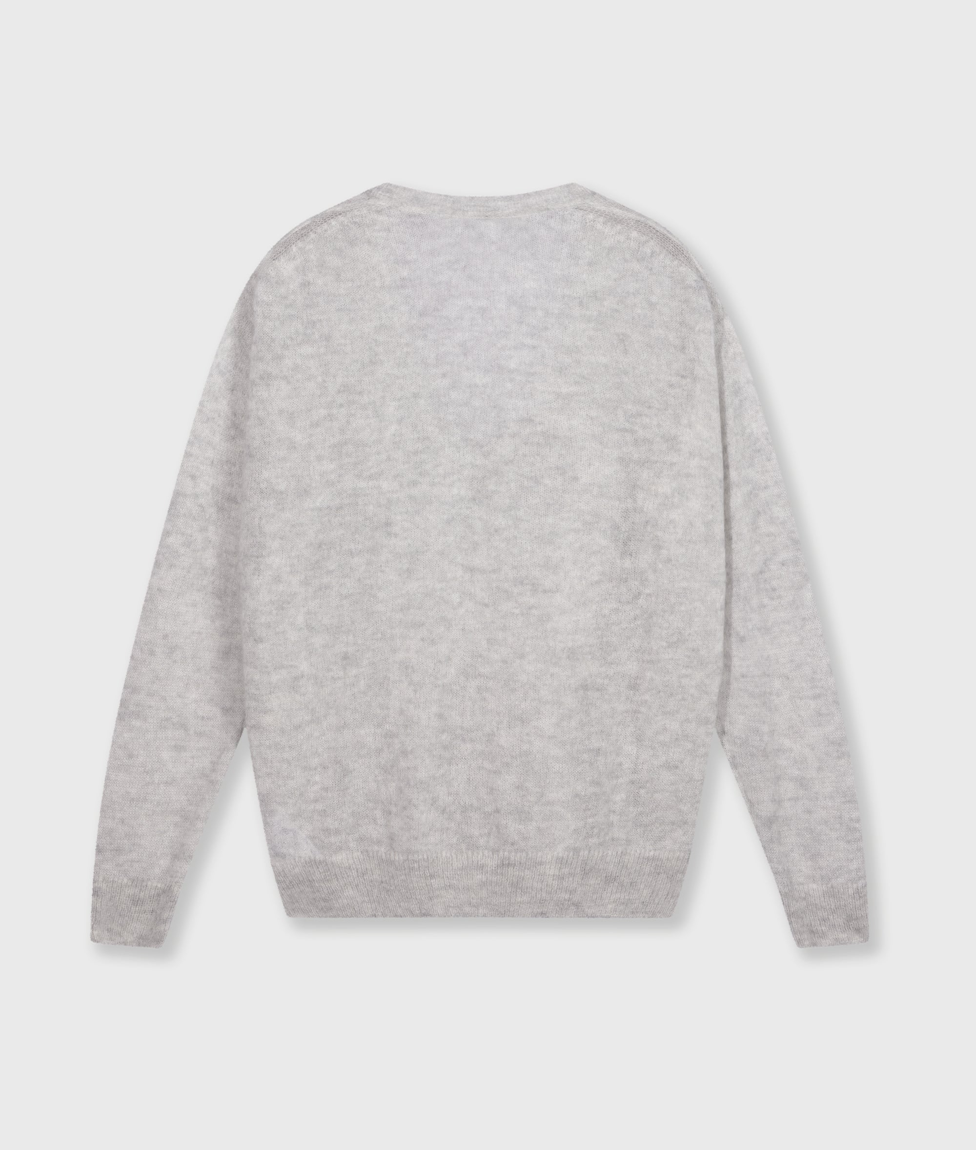 Relaxed fit thin knit sweater with V-neck, made from a soft alpaca wool blend. Features rib knitted cuffs and a mini stripes logo embroidery on the back, just below the neckline.|