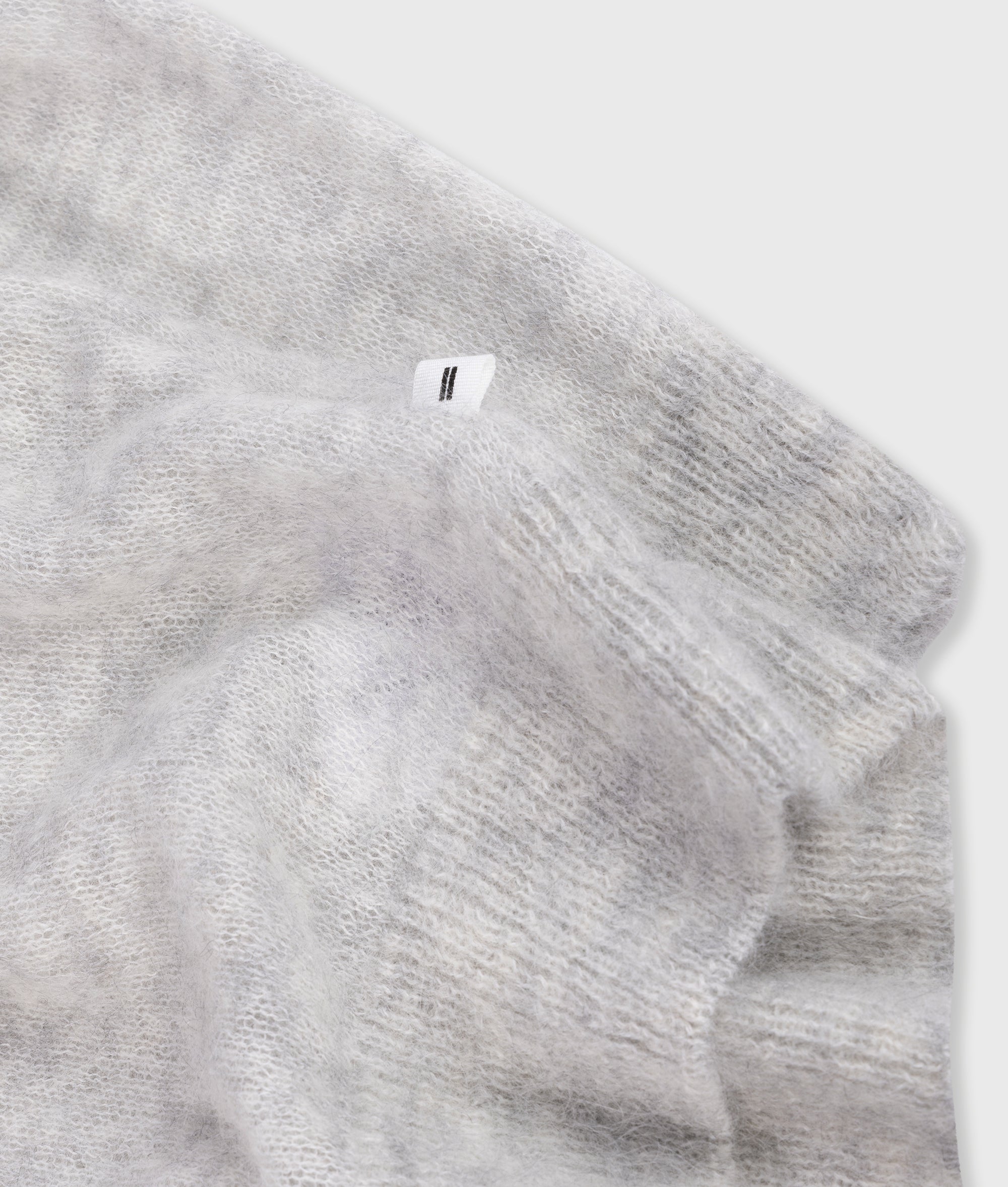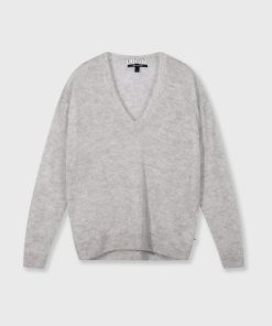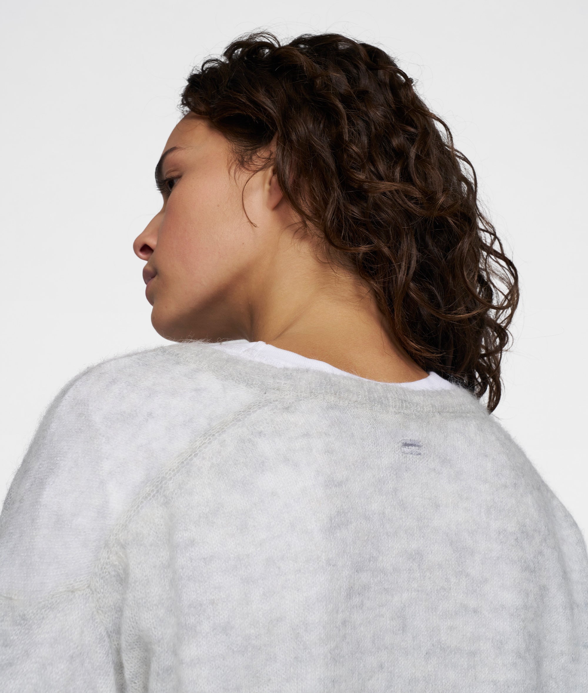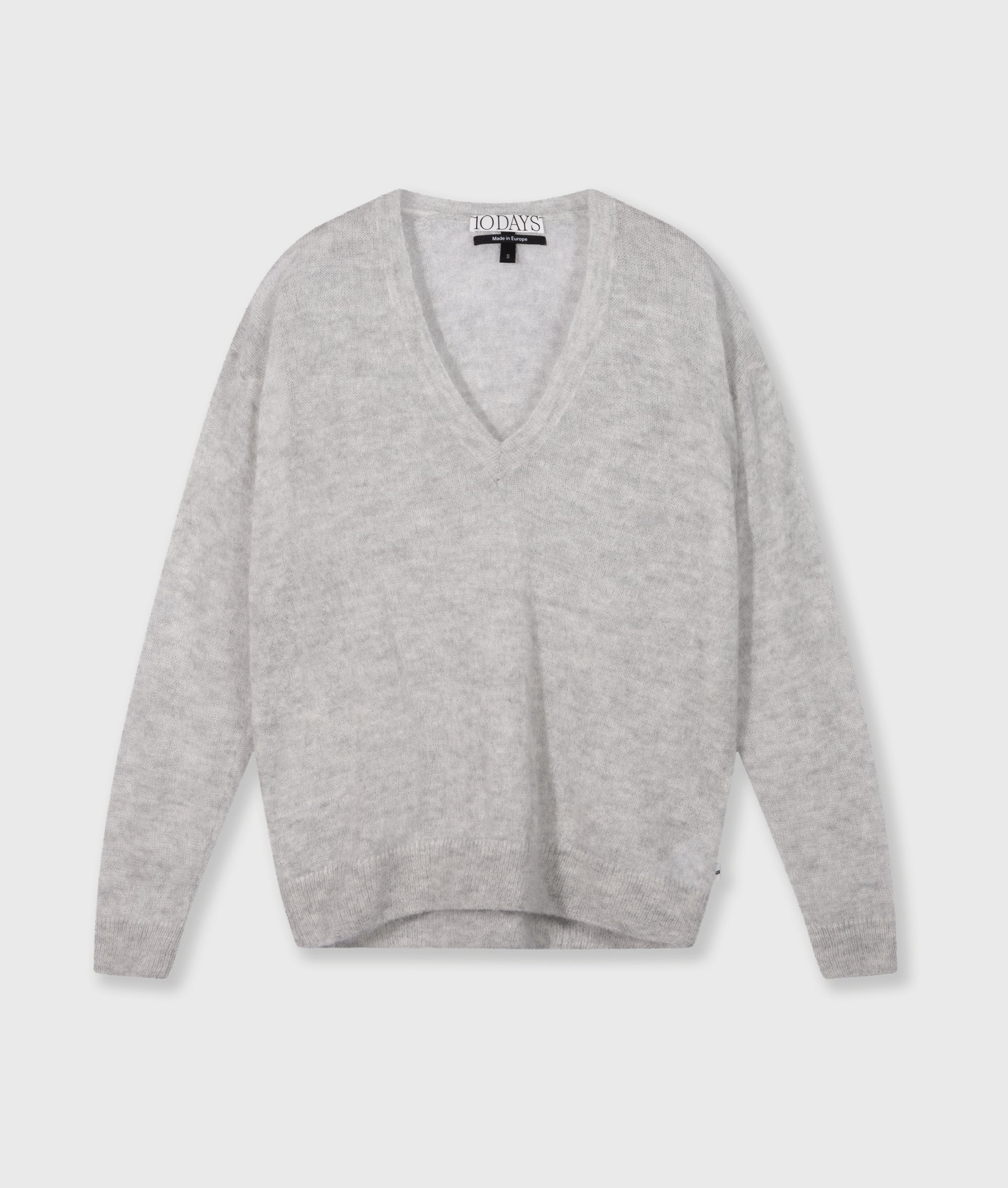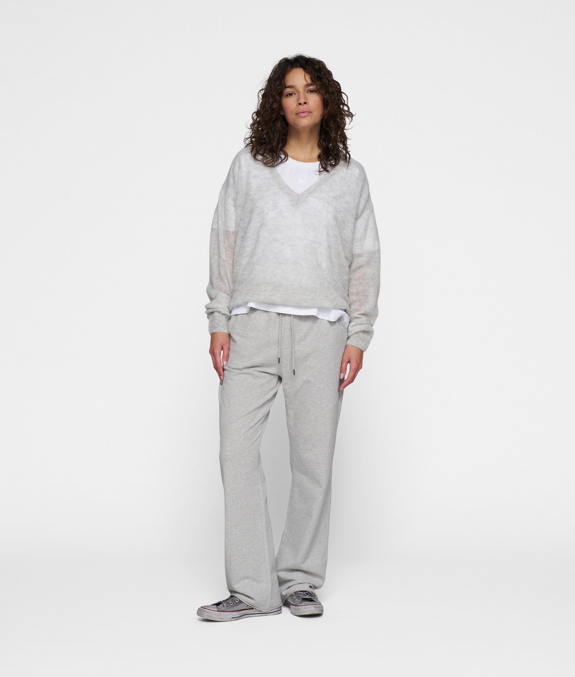Relaxed fit thin knit sweater with V-neck, made from a soft alpaca wool blend. Features rib knitted cuffs and a mini stripes logo embroidery on the back, just below the neckline.|