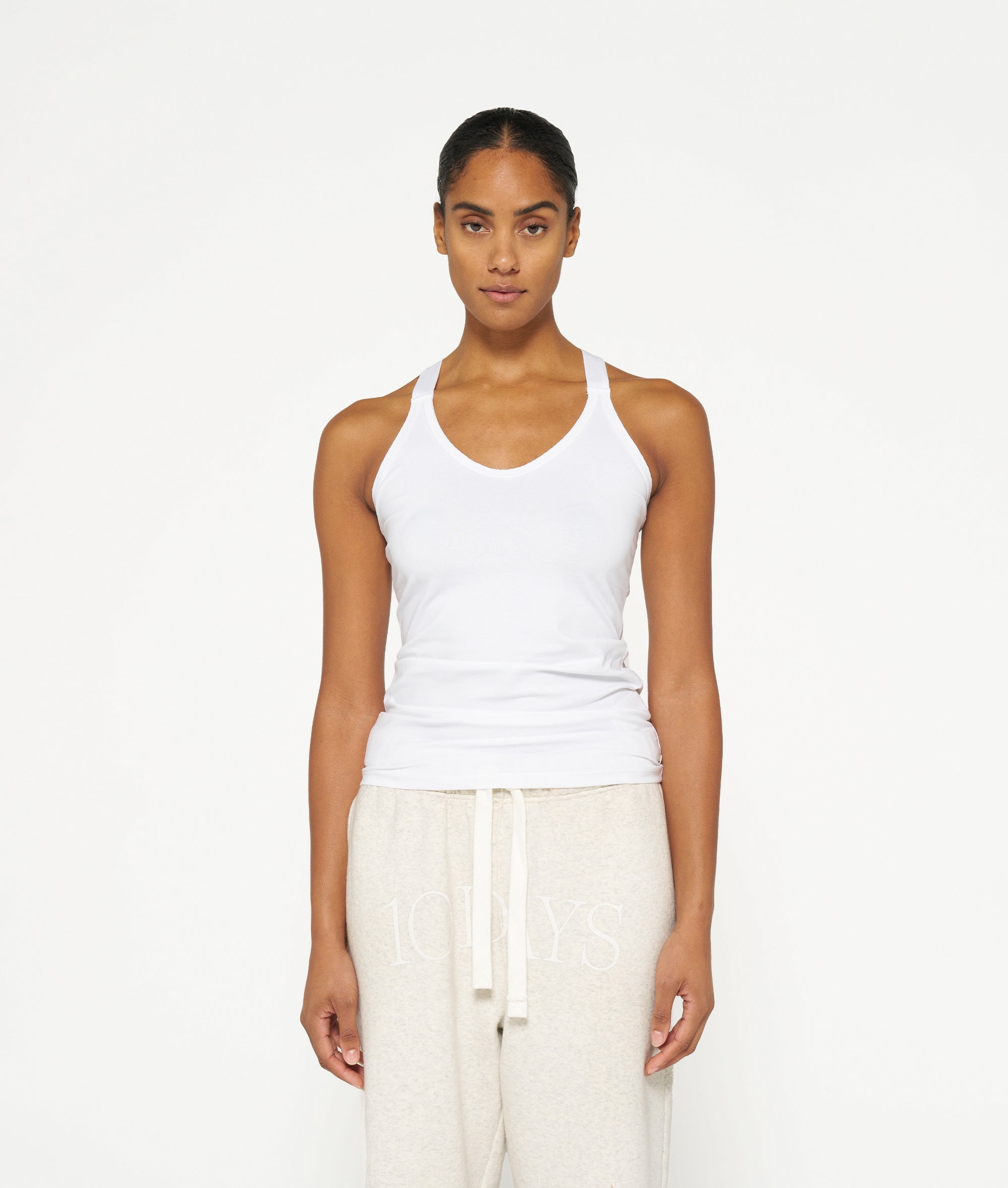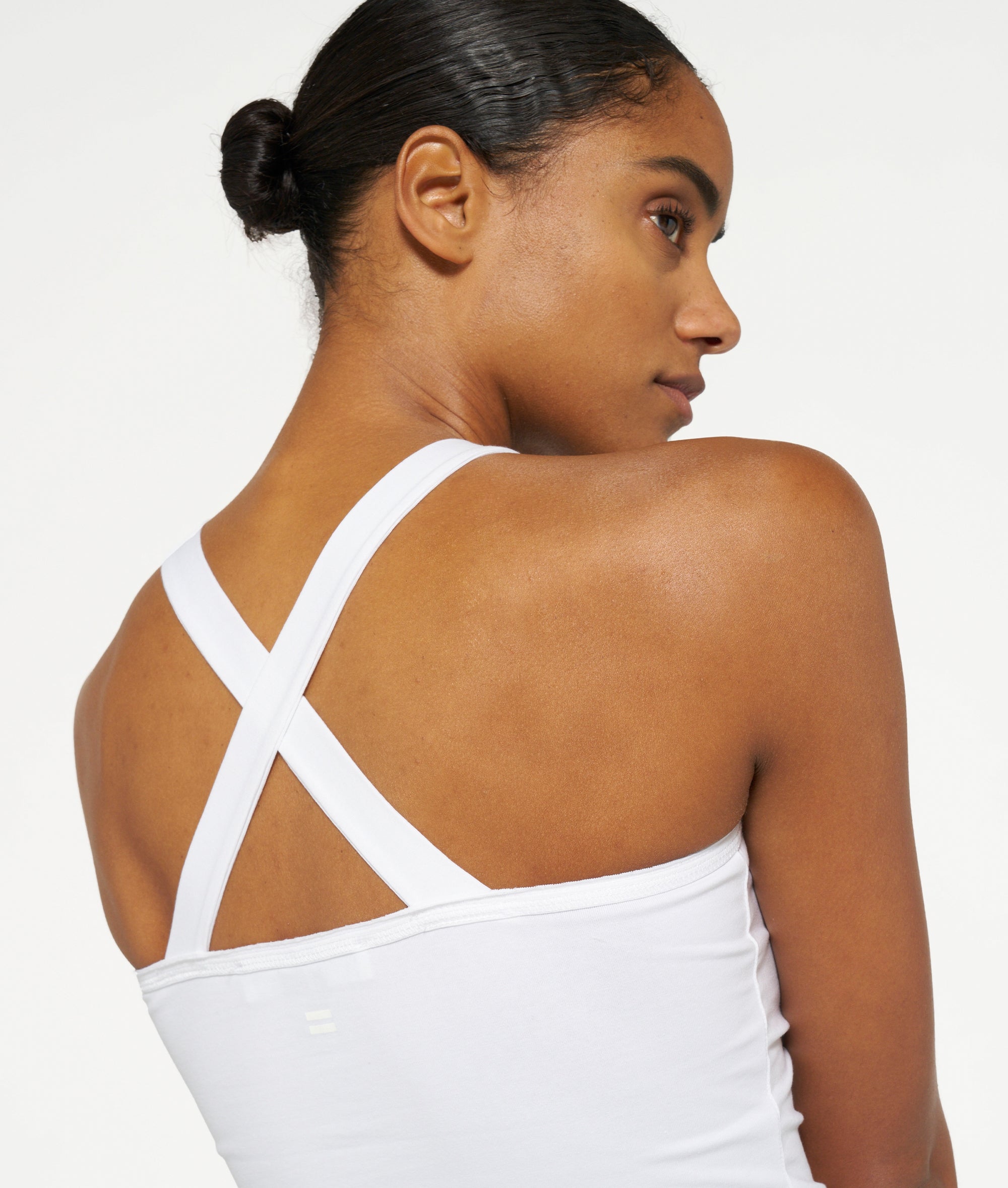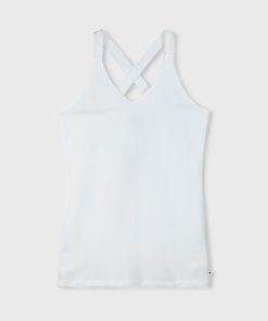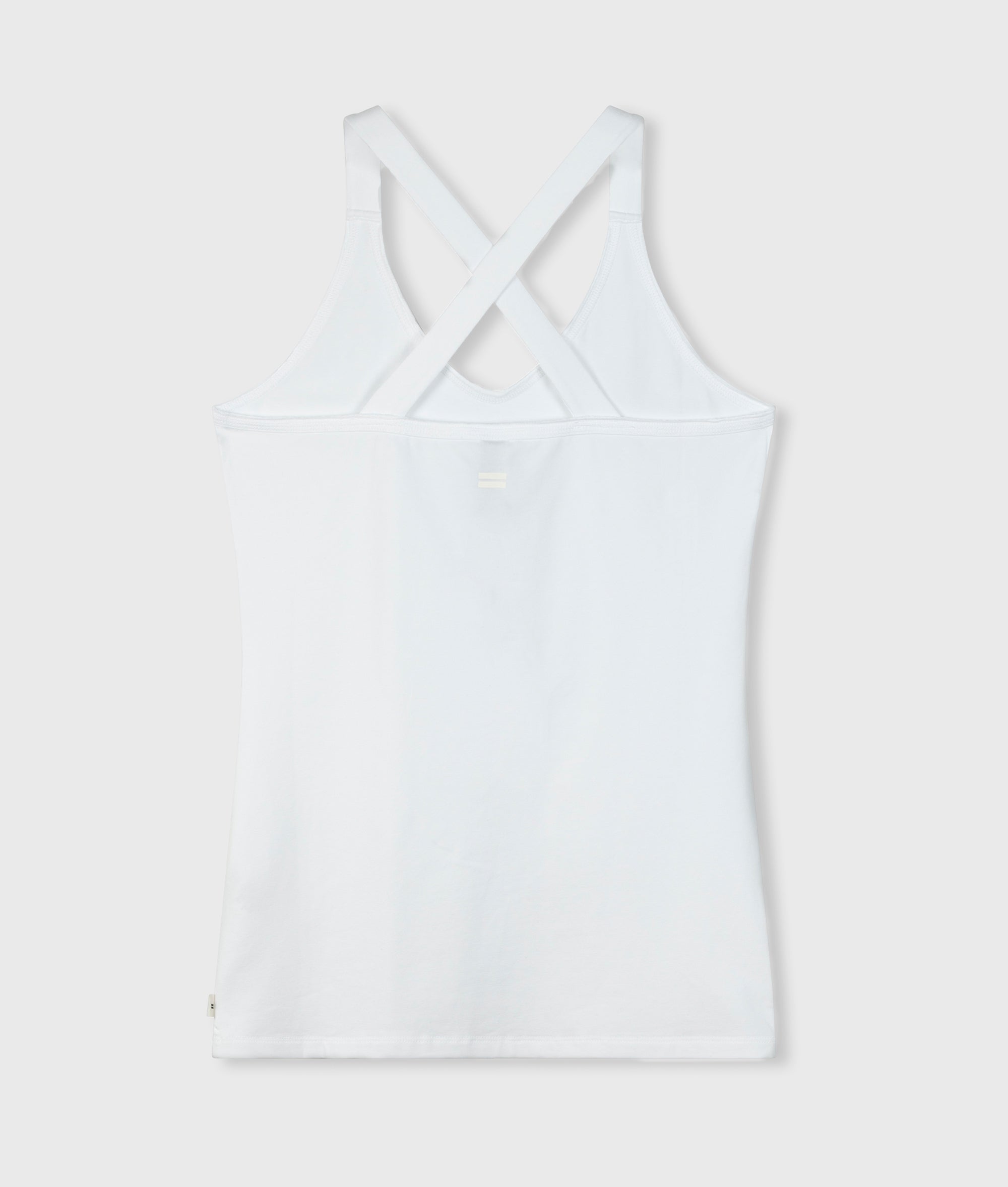 Slim fit singlet top with crossed straps at the back, made from organic cotton blend. Features a vintage finish around the neck and a mini stripes logo on the back.|