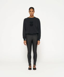 Slim fit leather look leggings with zip details. Features an elastic waistband, zip pockets, raw edge decorative stitching and raw edge legs with zips.|