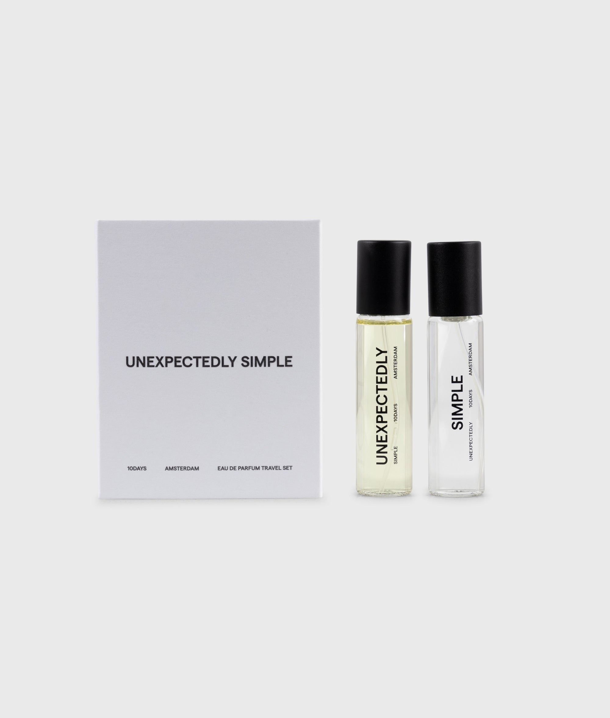 UNEXPECTEDLY SIMPLE – 2x 15ML eau de parfum travel set from 10DAYS. Embodying Amsterdam’s vibrant spirit, “UNEXPECTEDLY” bursts with dynamic energy and vibrant unpredictability, while “SIMPLE” imparts a scent of effortless elegance and intentional simplicity. Embrace the Unexpected, Celebrate the Simple.|