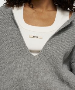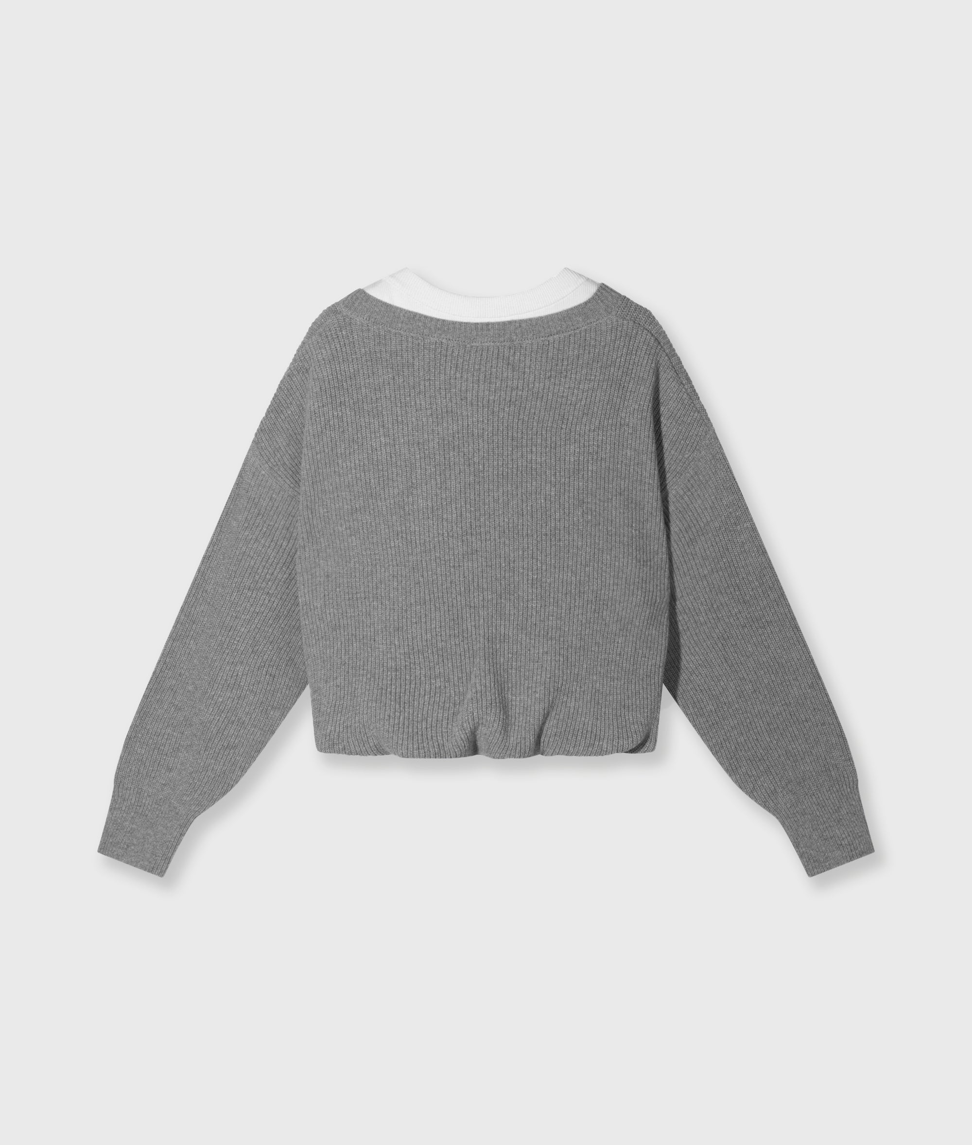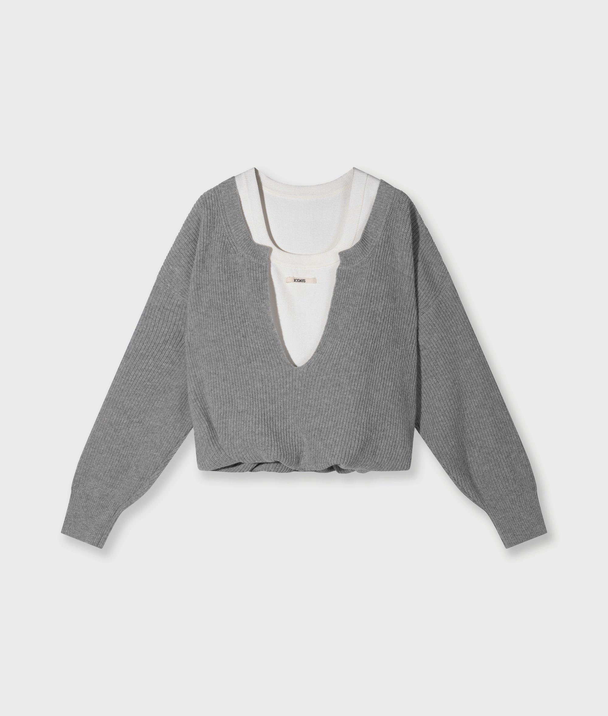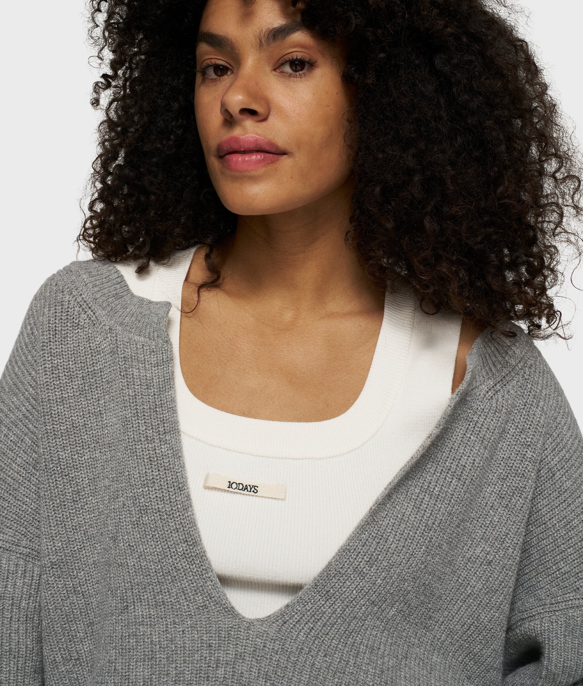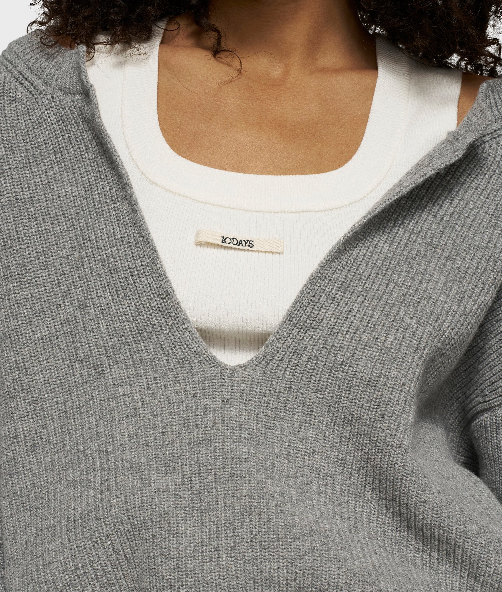 Relaxed fit knitted cashmere V-neck sweater, made from a soft wool-cashmere blend. Features a fixed inner tank top with a round ribbed neckline, a balloon-shaped hem and a ’10DAYS’ canvas label on the front of the tank top.|