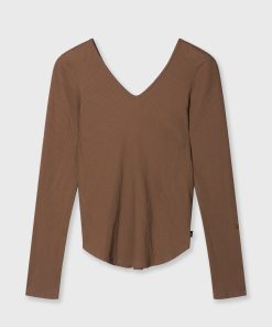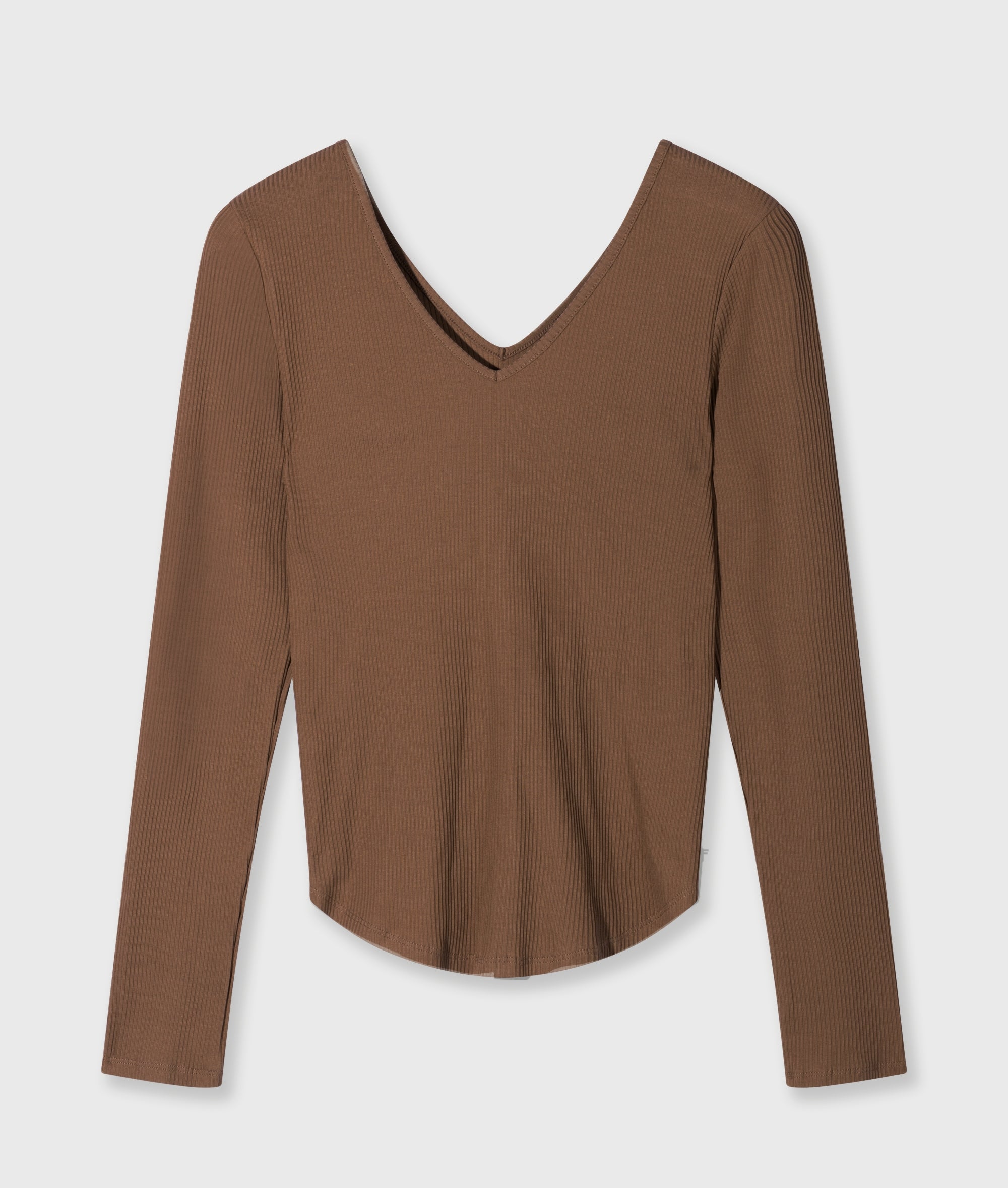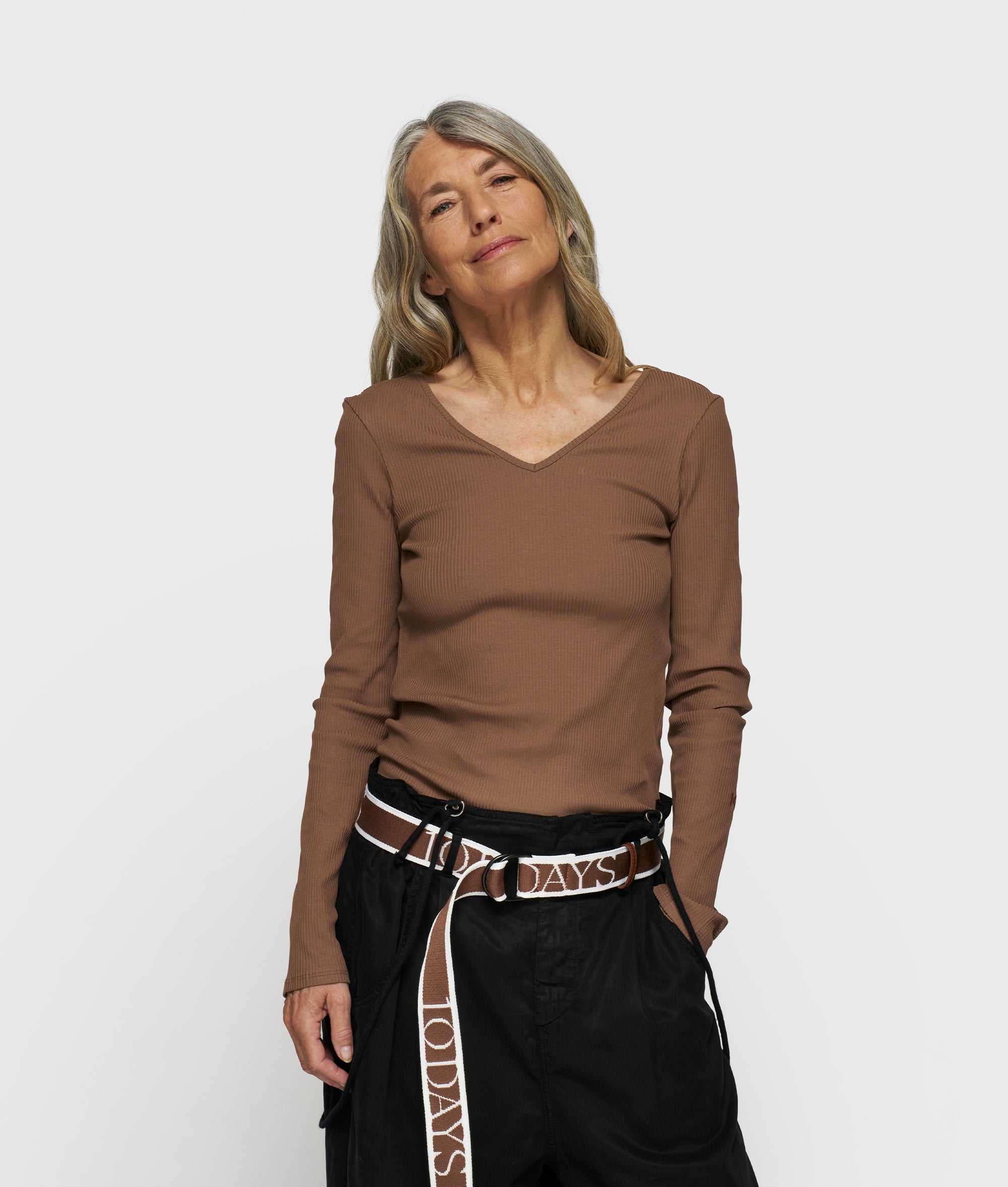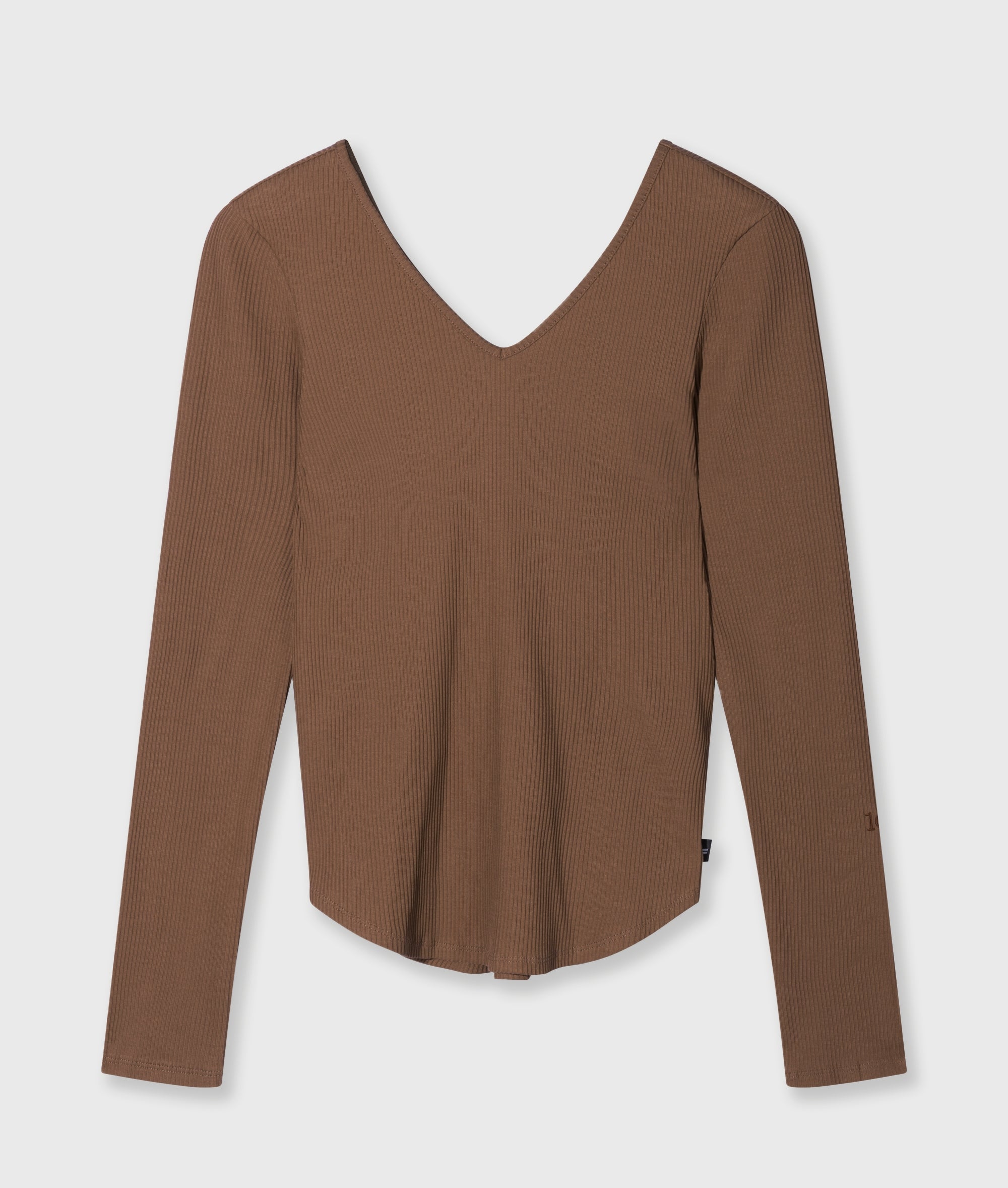 Slim fit long sleeve top made from soft GOTS-certified organic cotton rib jersey. Featuring a deep V-neckline, curved hem, monogram embroidery on the left sleeve and a mini stripes label at the hem.|