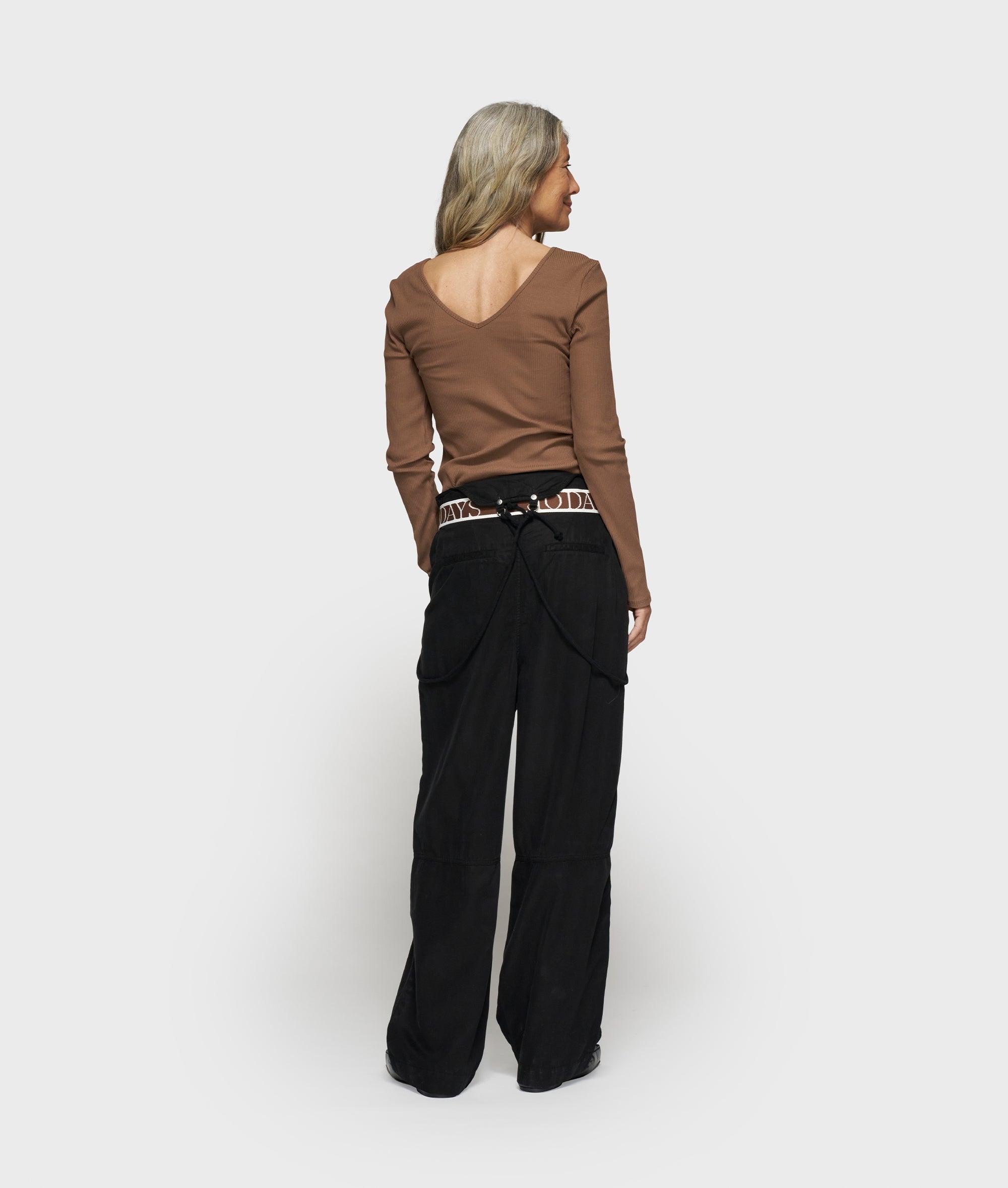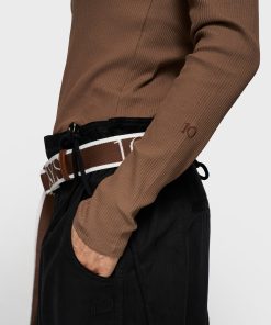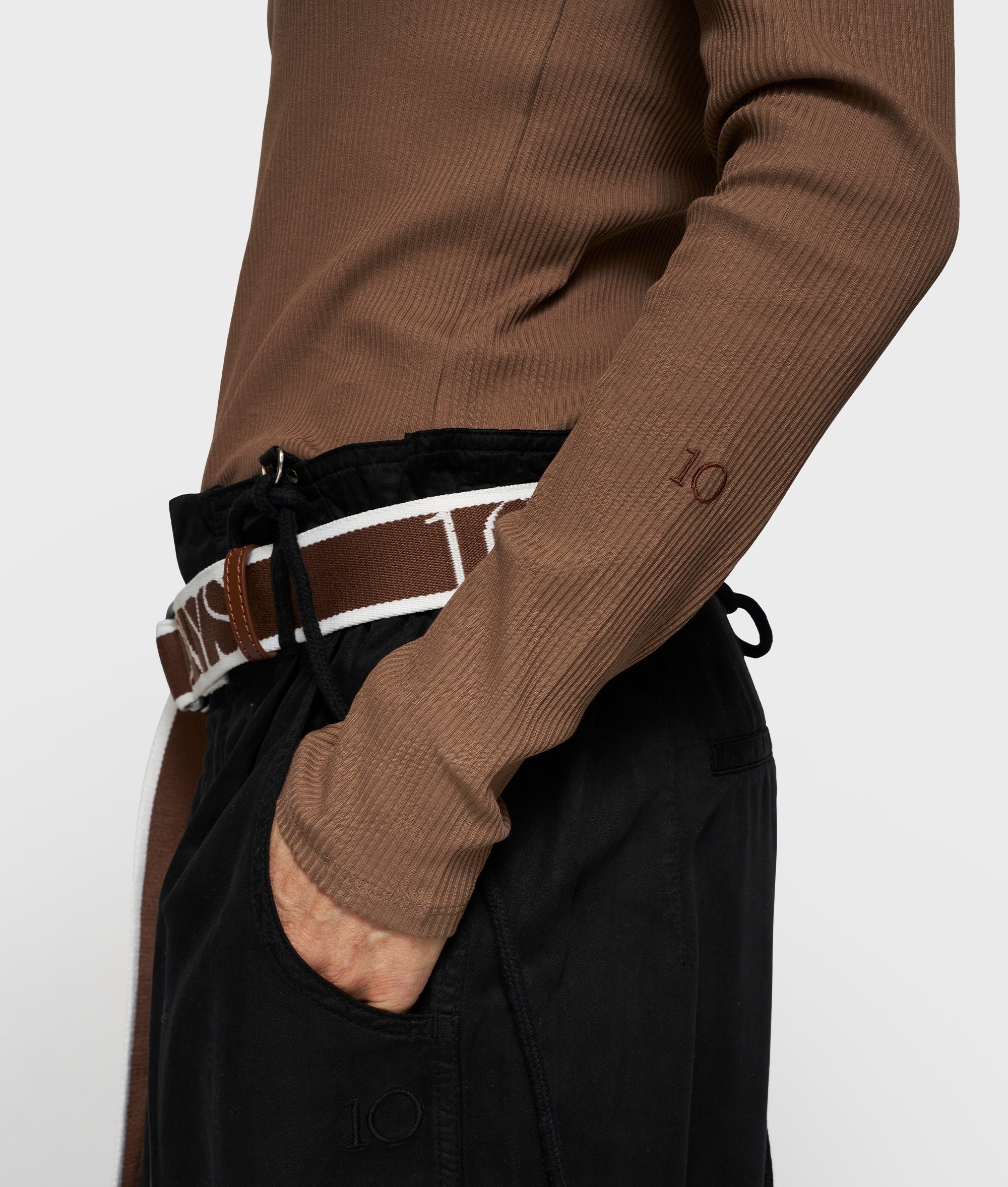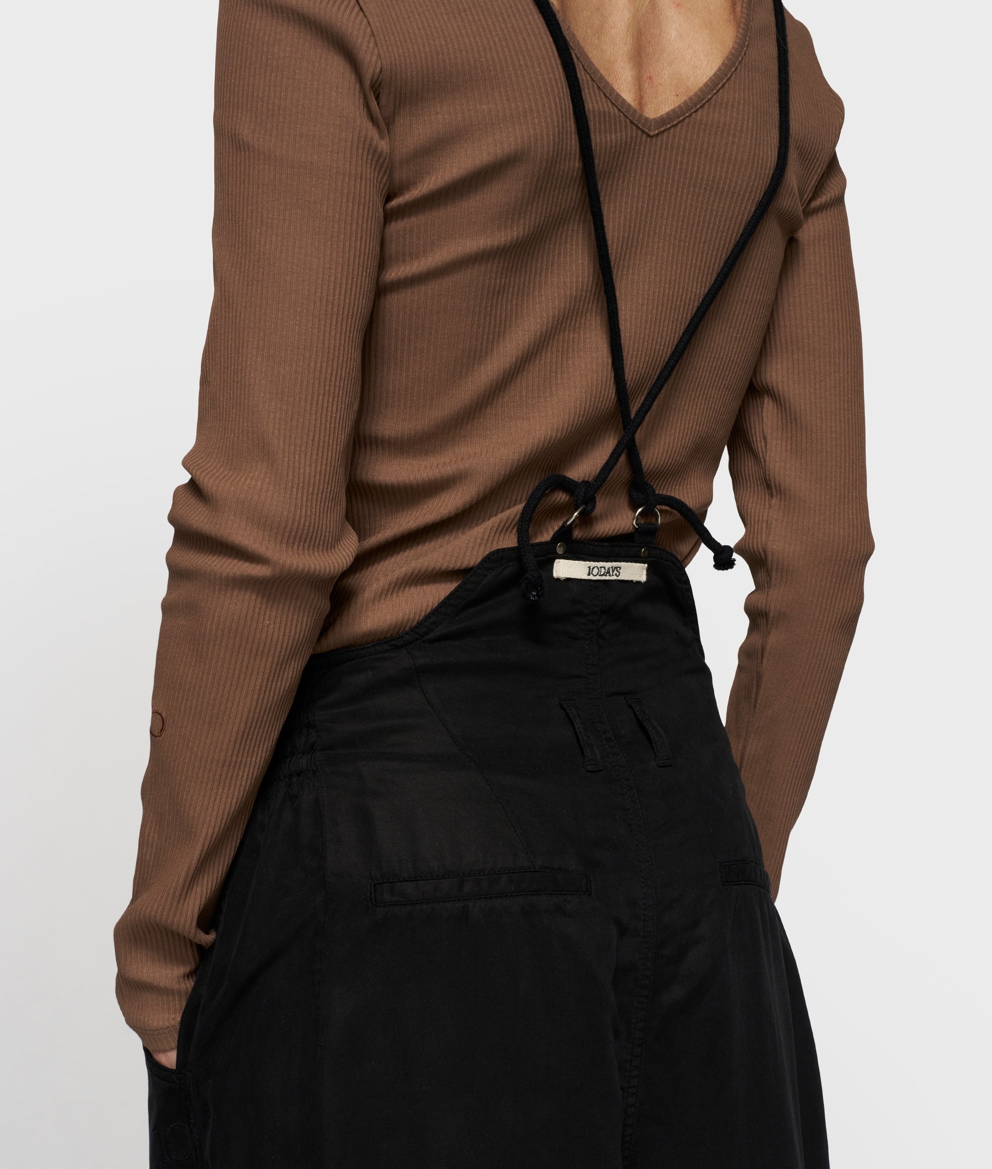Slim fit long sleeve top made from soft GOTS-certified organic cotton rib jersey. Featuring a deep V-neckline, curved hem, monogram embroidery on the left sleeve and a mini stripes label at the hem.|