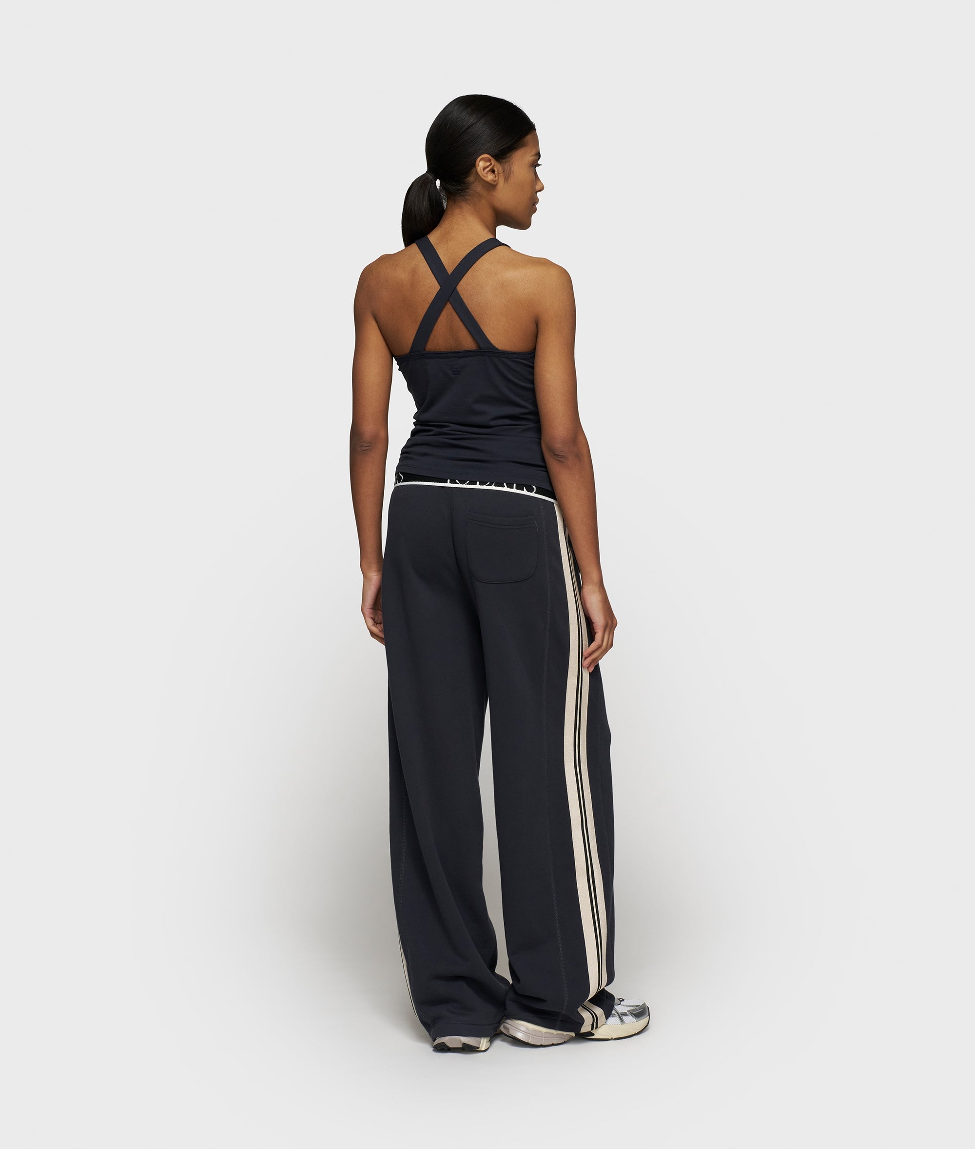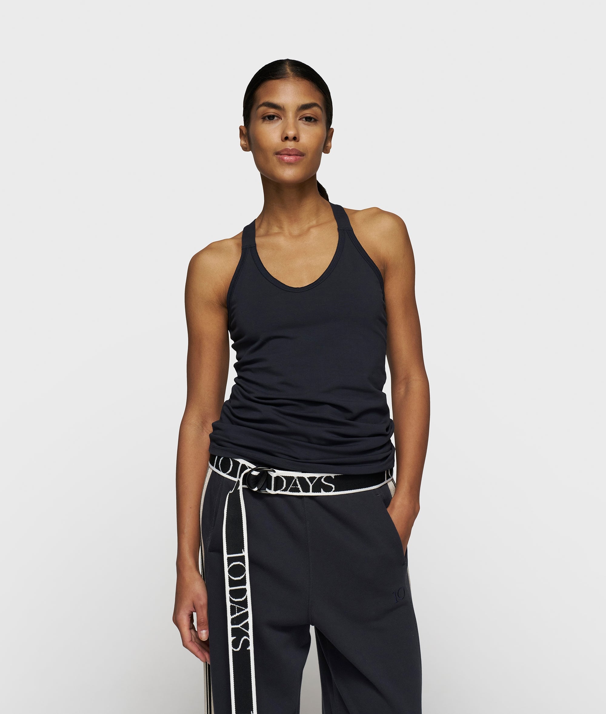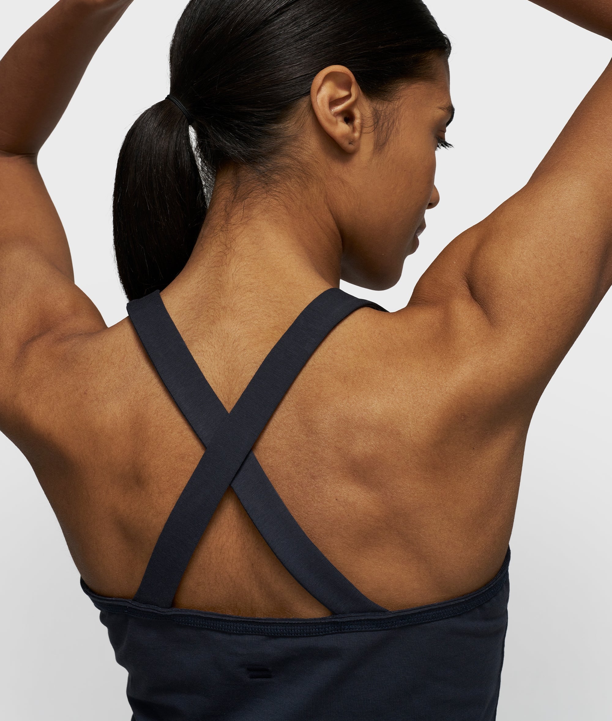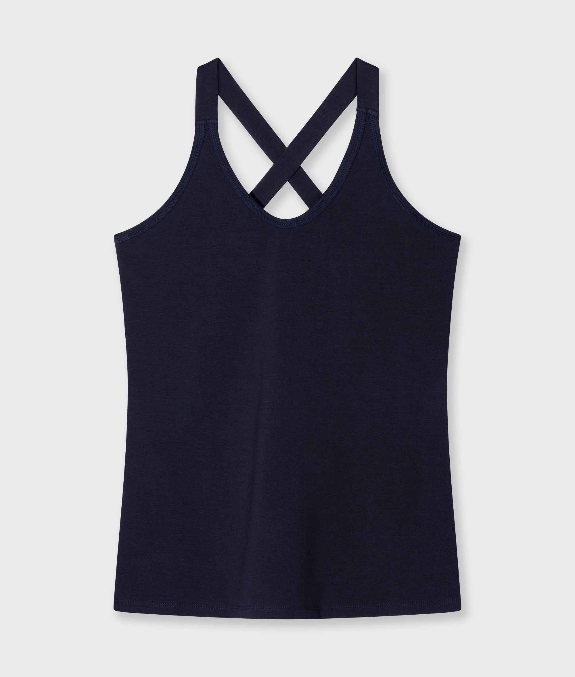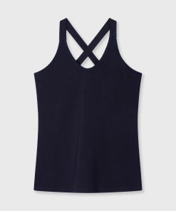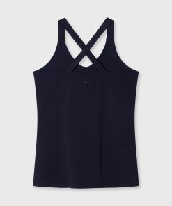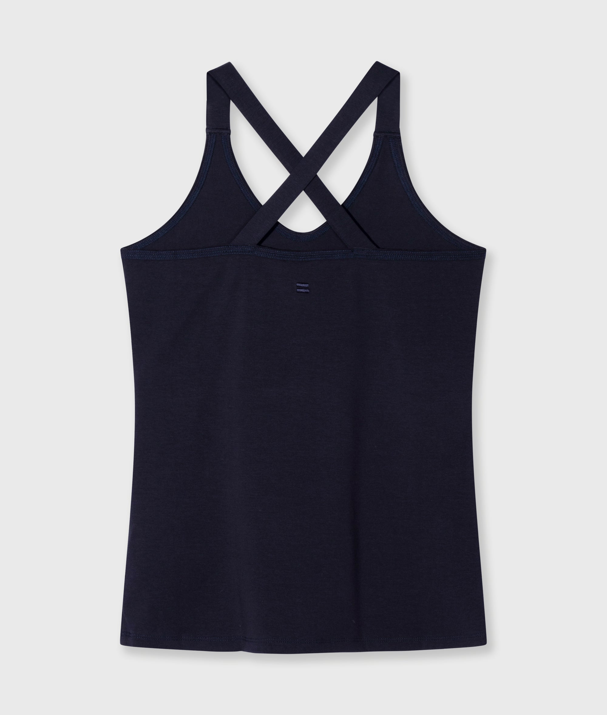 Slim fit singlet top with crossed back straps, made with GOTS-certified organic cotton. Features a vintage-finished neckline and a mini stripes logo embroidery on the back.|